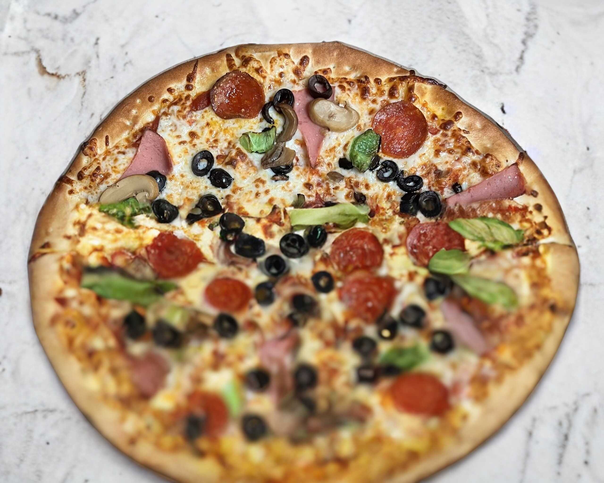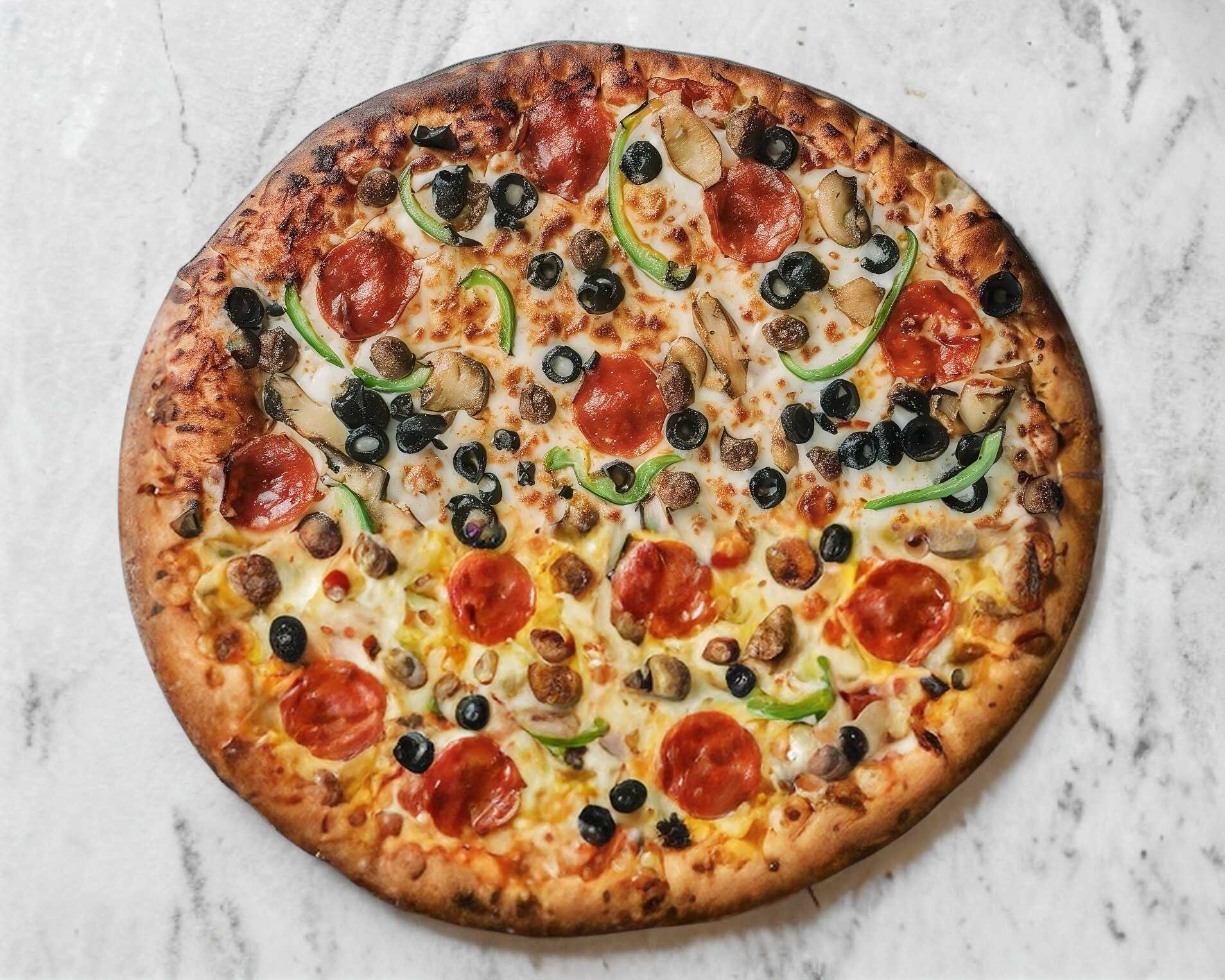 10 Rebanadas. Pepperoni, jamón, aceitunas negras, champiñón y morrón.