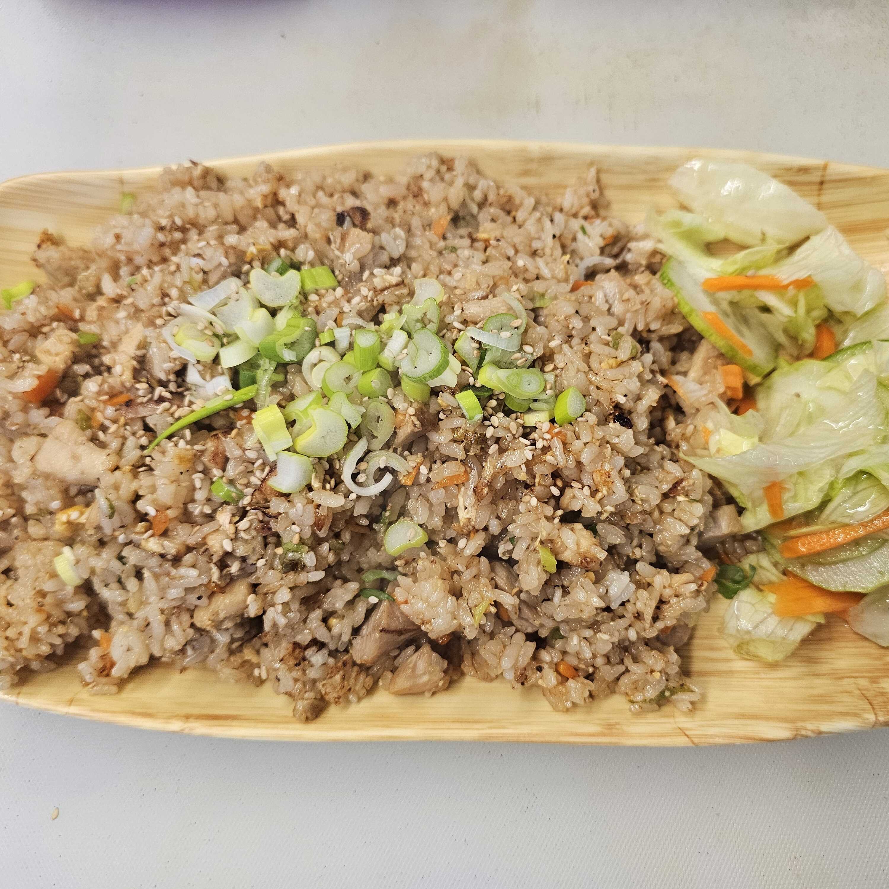 Arroz frito con huevo revuelto, trozos de pollo, cebollin y ajonjoli