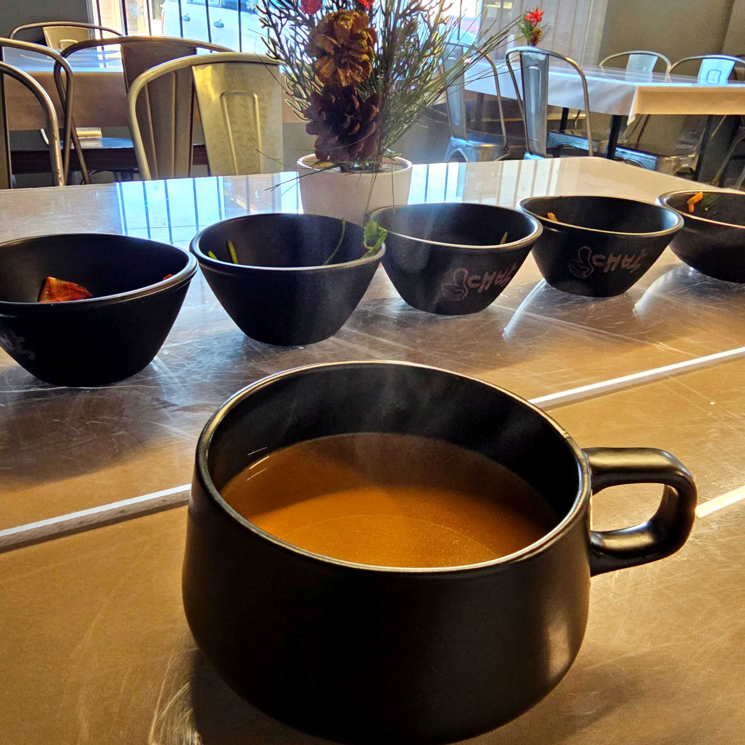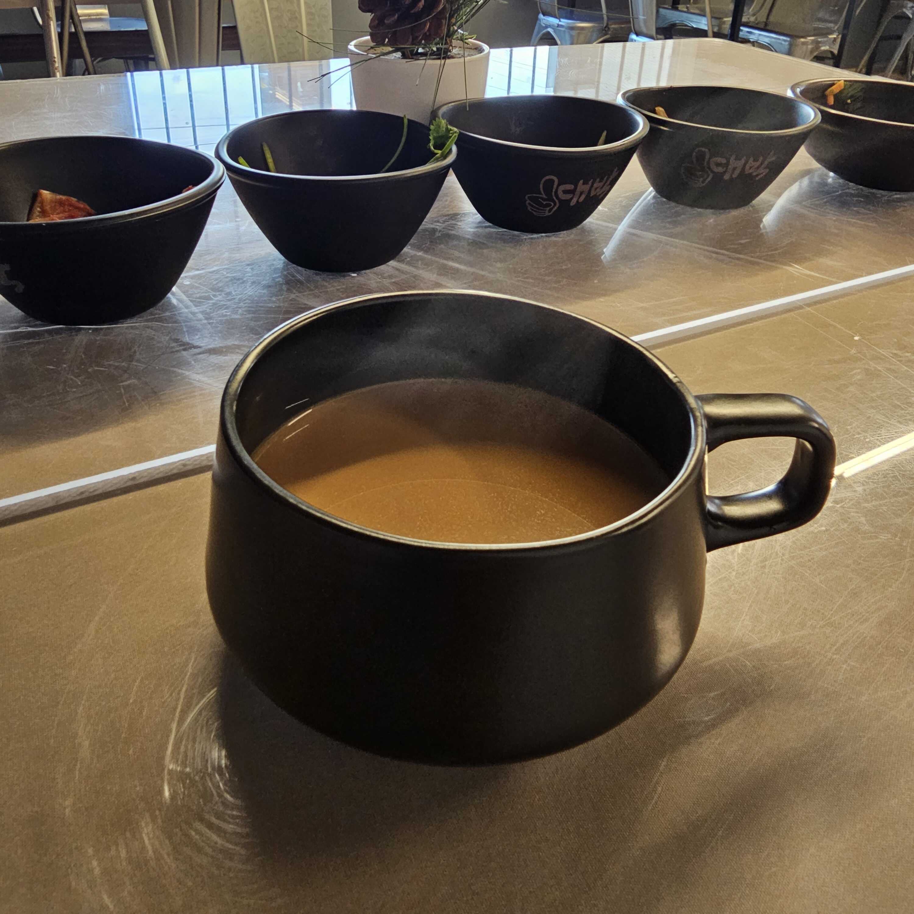 Caldo con pasta picante o no picante, 1/2 huevo duro, camarón, calamar, choro, cebollin y shapsuy
