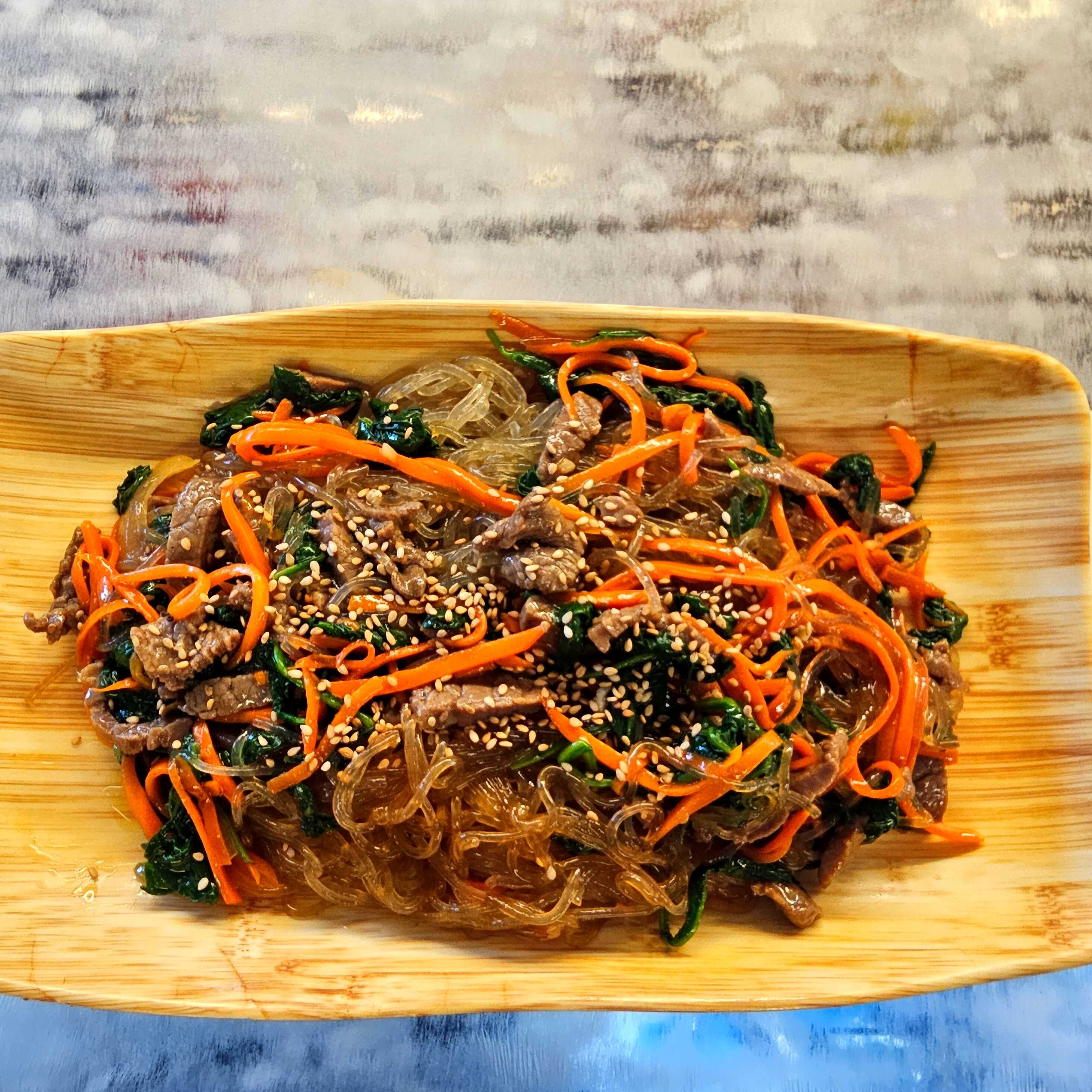 Fideos cristalinos hechos de camote, acompañados de tiras de carne de res, espinacas, zanahoria y cebolla, bañados en una salsa agridulce.