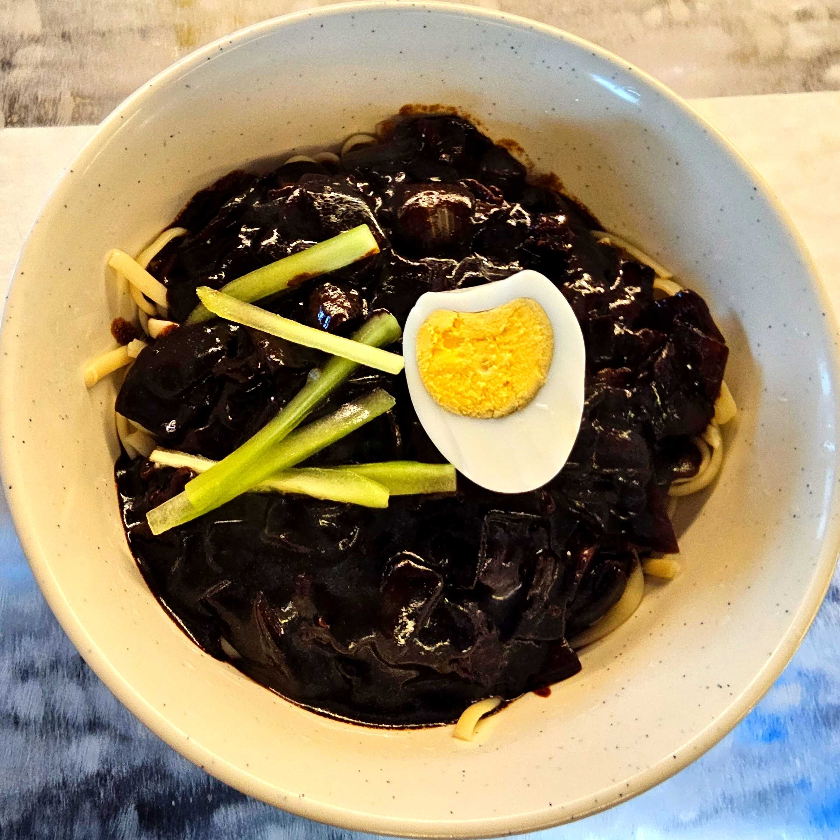 Fideos Coreanos cubiertos con salsa espesa de Chunjang (salsa de frijol negro) carne de cerdo, cebolla y papa cortada en cubitos.