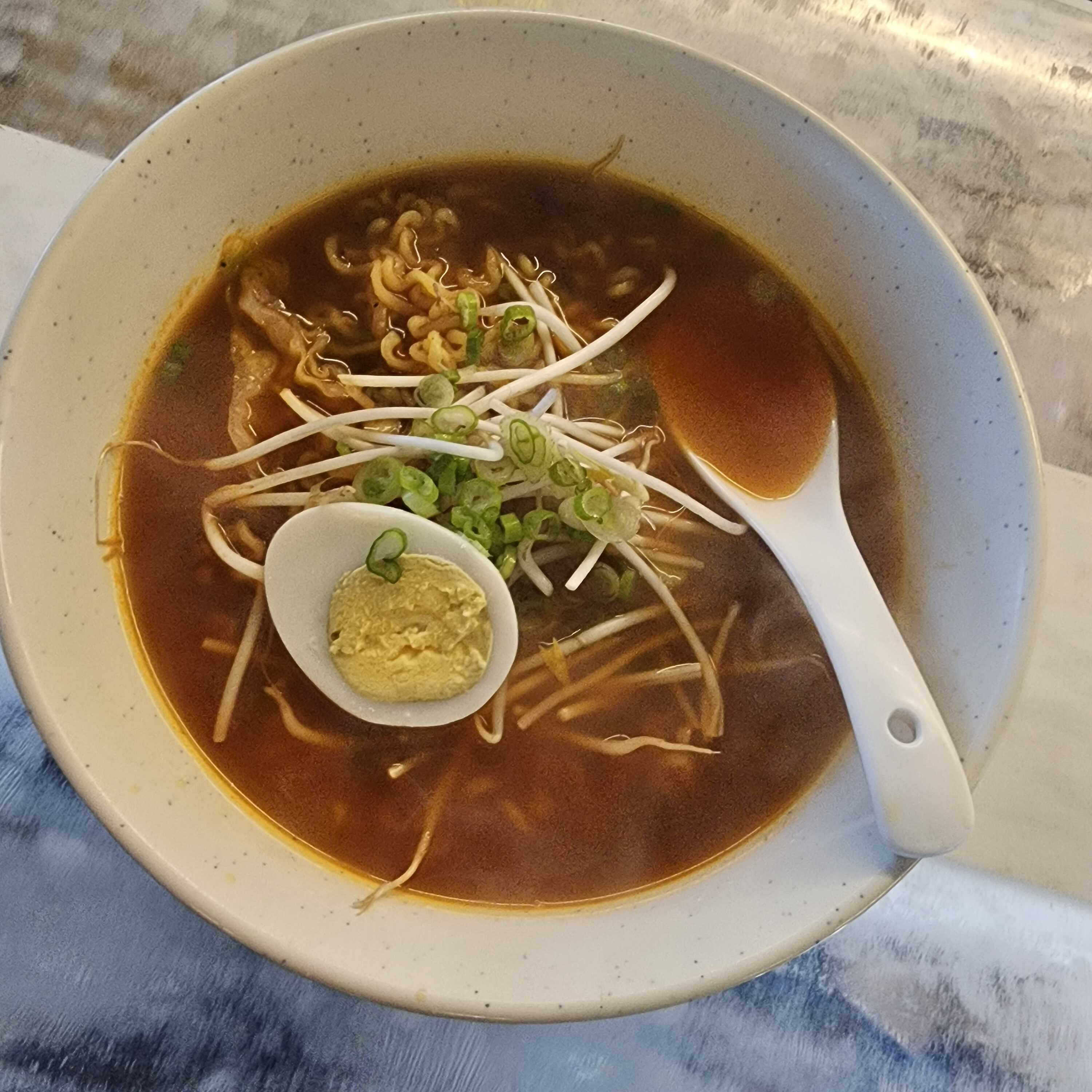 (Ramen Clasico).Pasta con caldo picante o no picante, cebollin, 1/2 huevo duro, repollo y chapsuy.