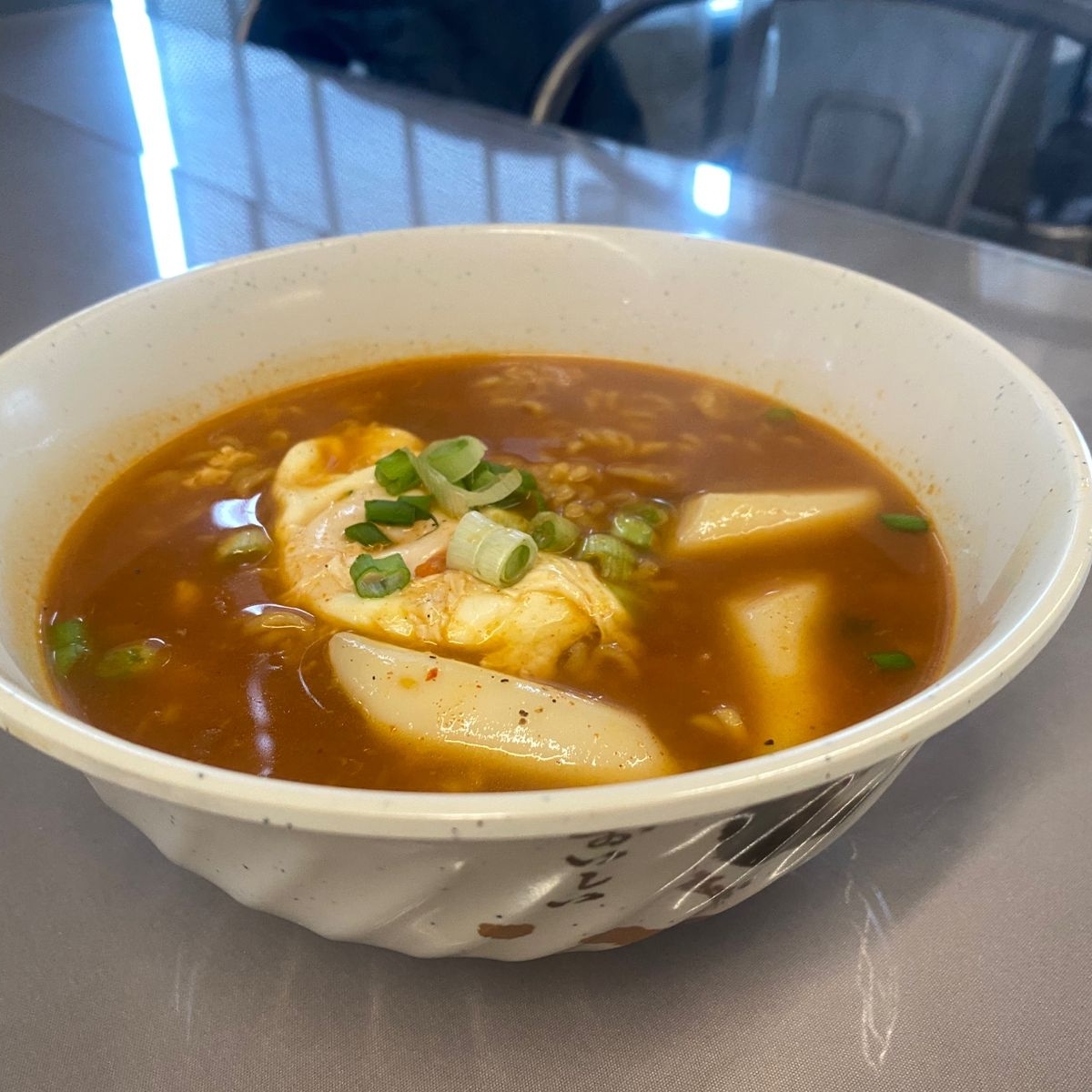 Pasteles de arroz y odeng (pasteles de pescado) cebollin y huevo duro bañados en salsa picante Gochujang.