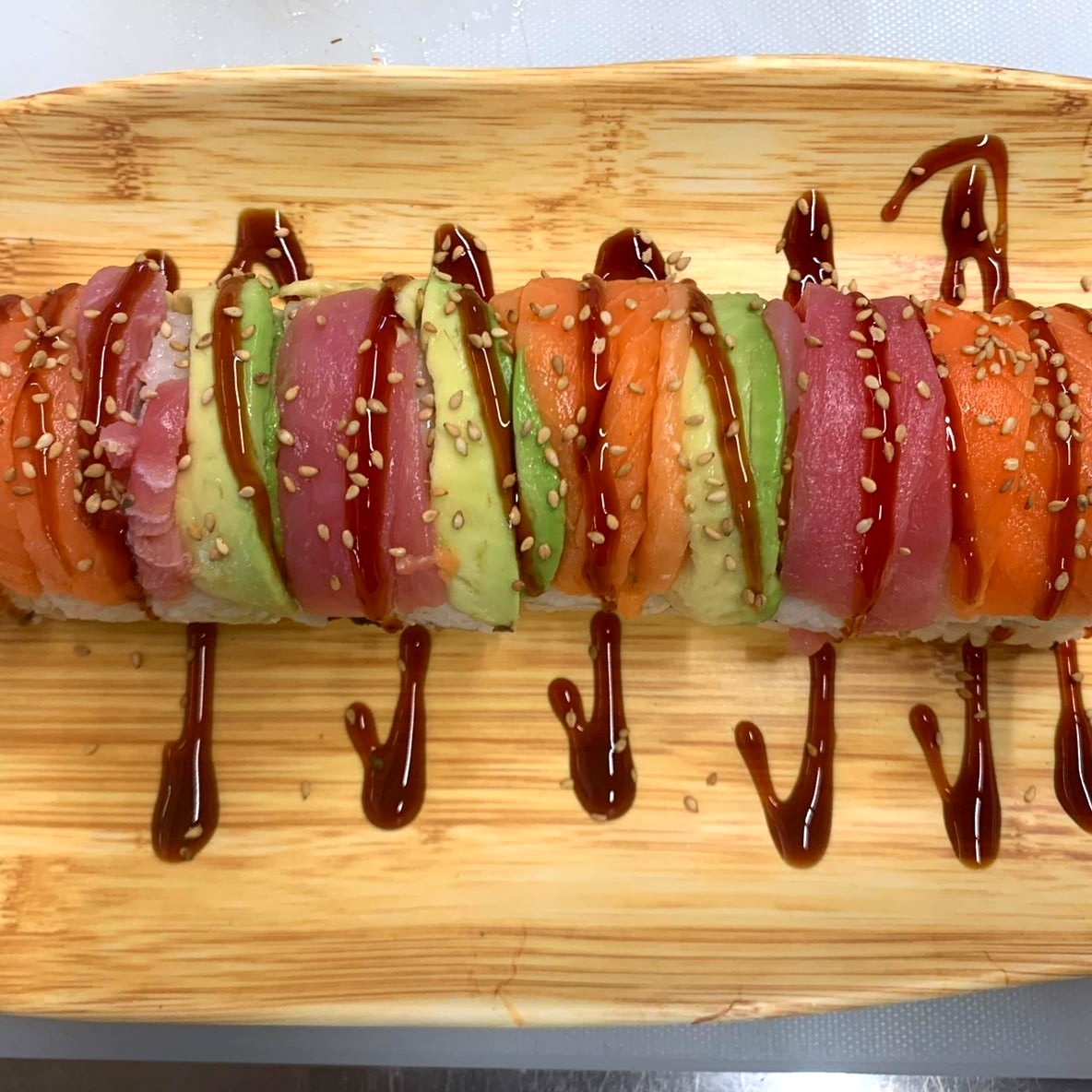 Rollo relleno de pepino, aguacate, queso crema y surimi, cubierto con una variedad de pescados crudos como salmón, atún y aguacate.