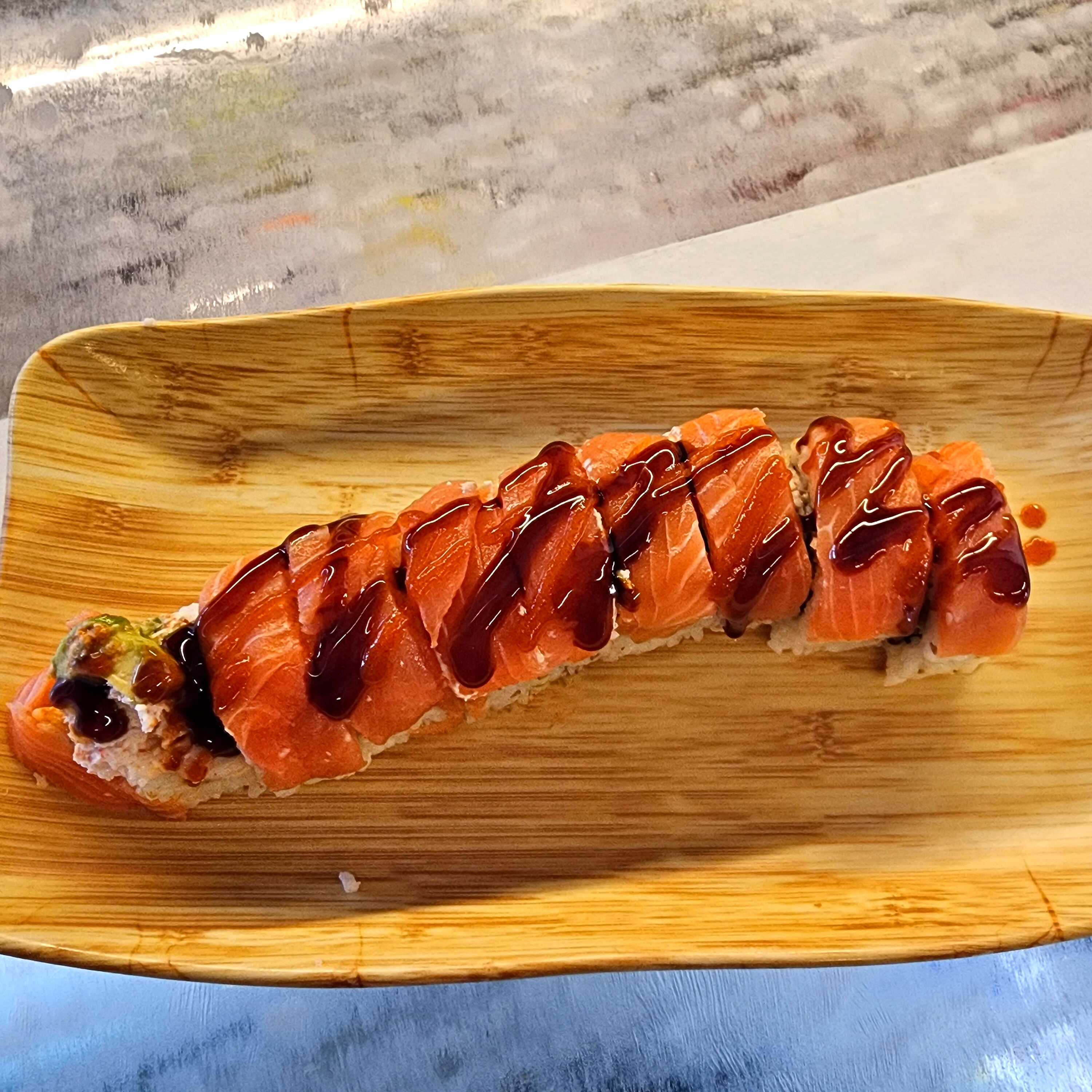 Rollo picante relleno de aguacate, queso crema, pepino, salmón y cangrejo.