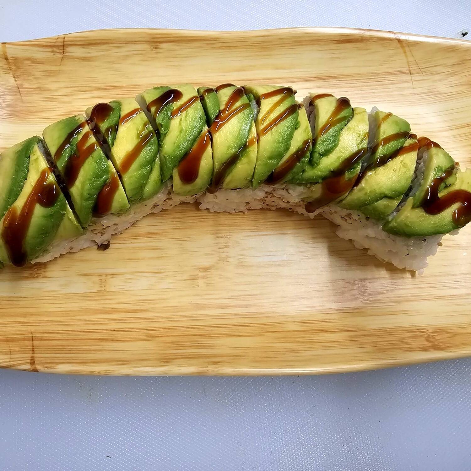 Rollo cubierto de aguacate con relleno de queso crema, pepino, aguacate y cangrejo.