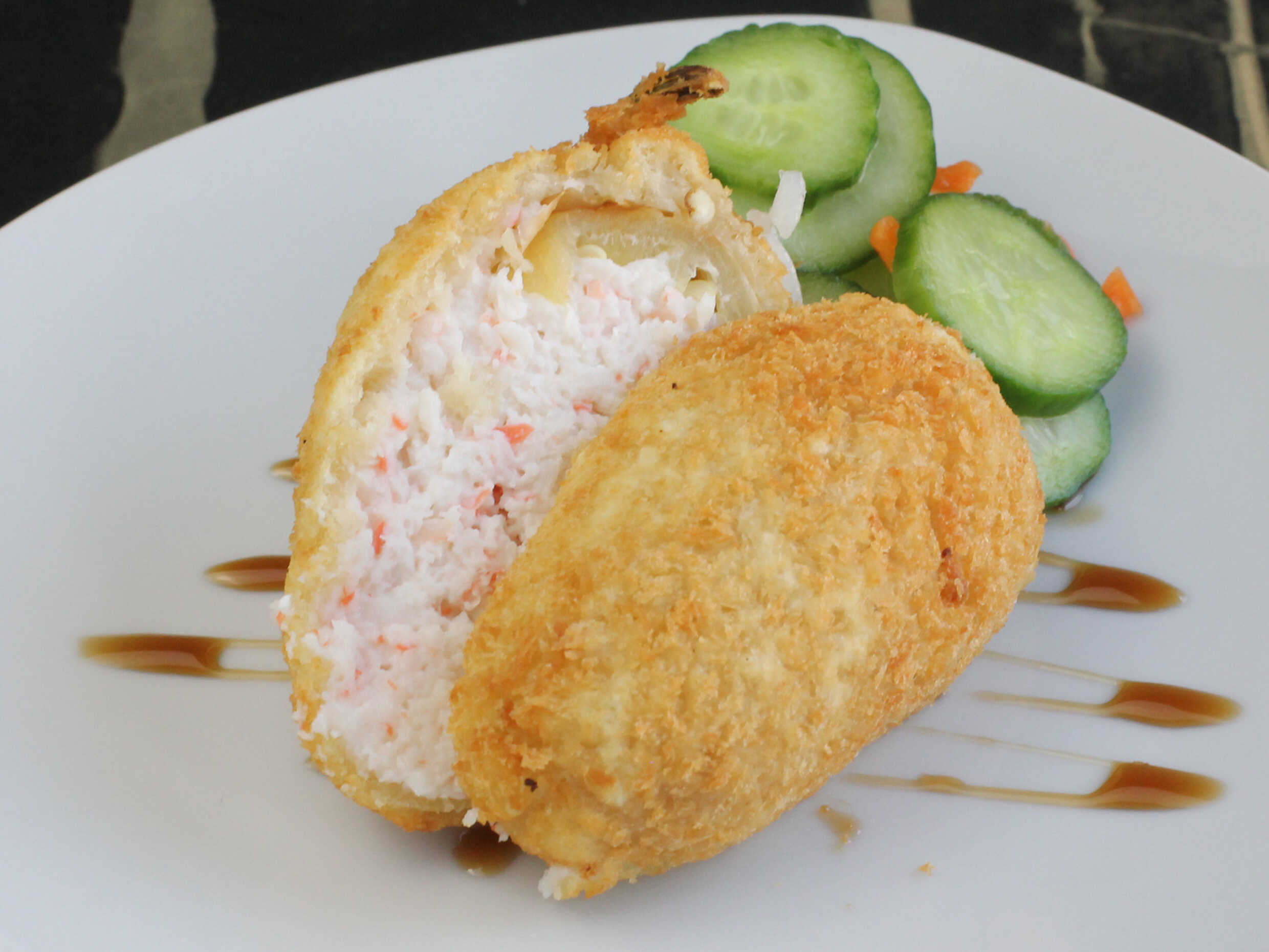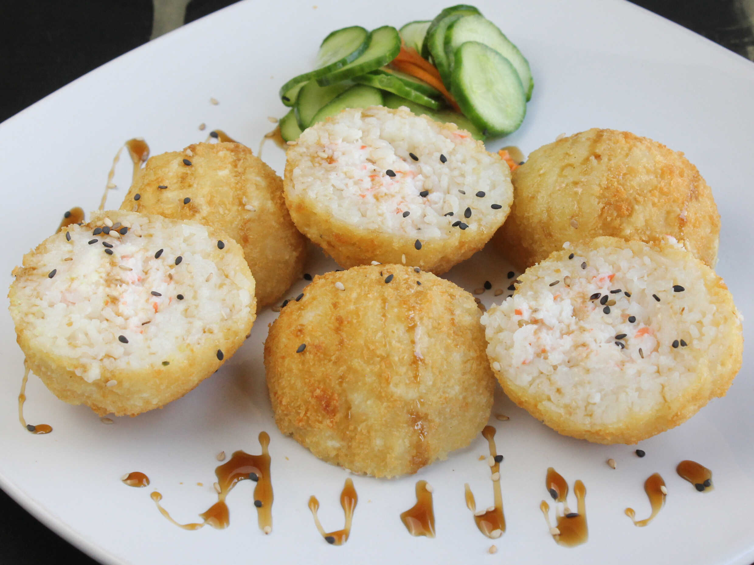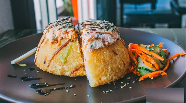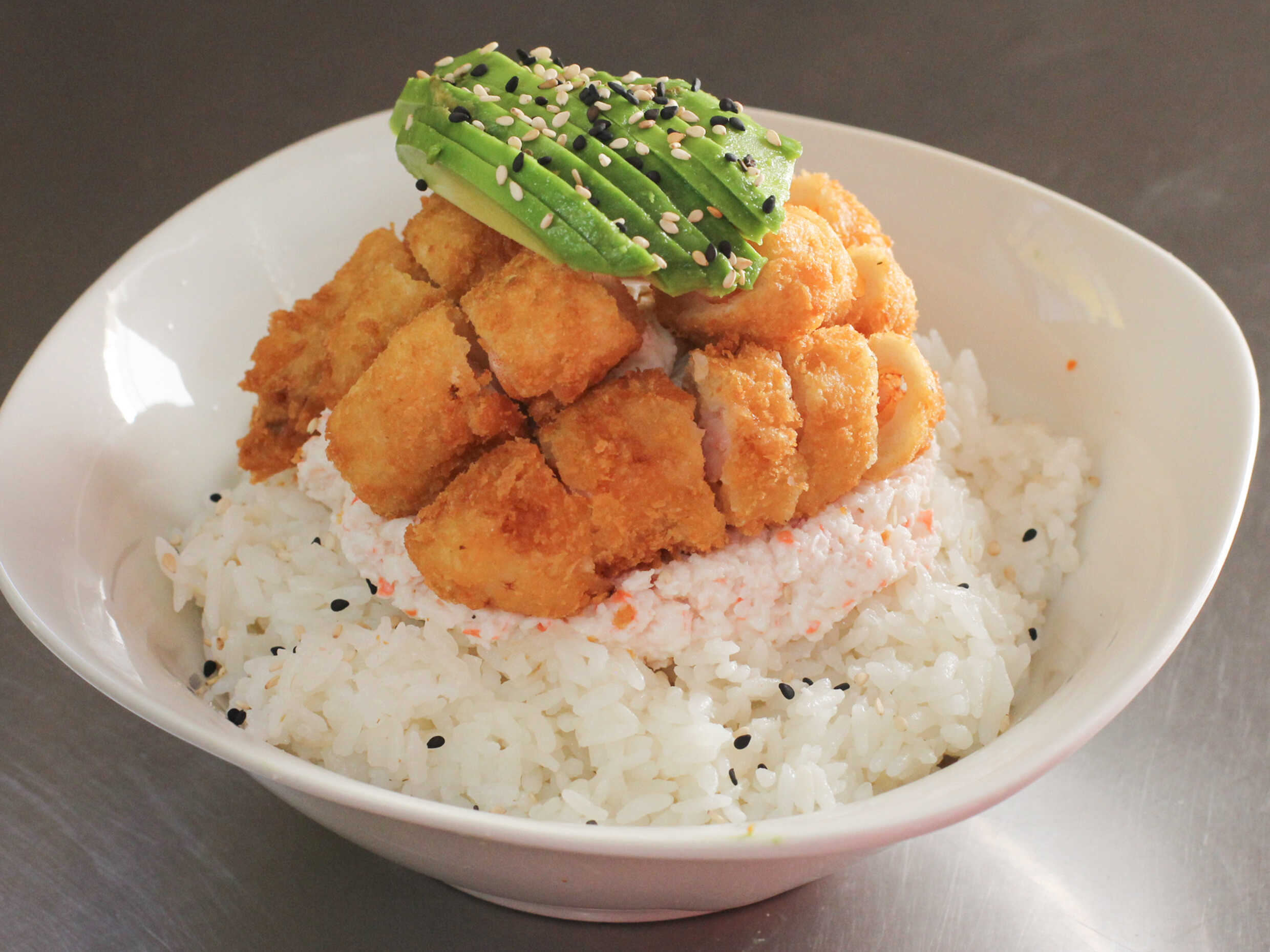 Tazón de arroz empanizado relleno queso crema, pollo, res, y surimi cubierto de Tampico