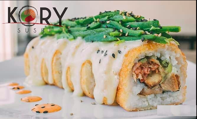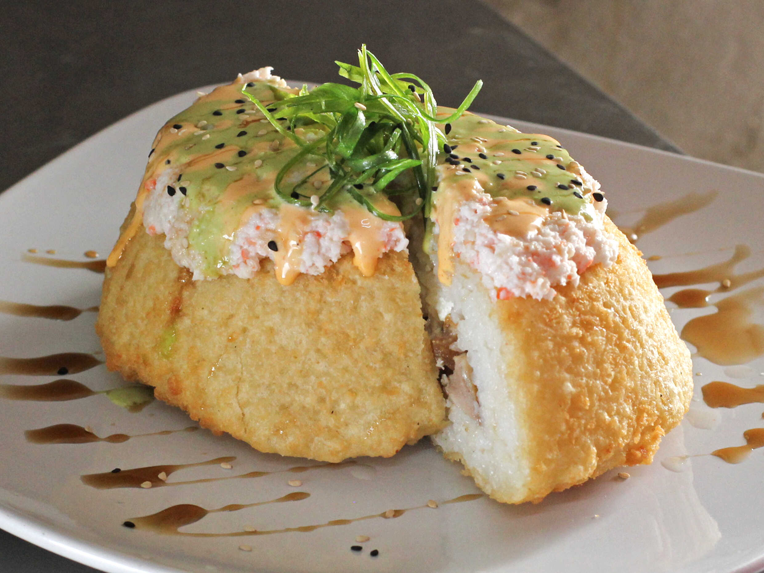 Tazón de arroz empanizado relleno de queso crema, pollo, res, surimi y camaron cubierto de Tampico.