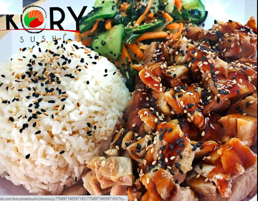 Arroz blanco , salsa Teriyaki y ajonjolí, pollo a la plancha