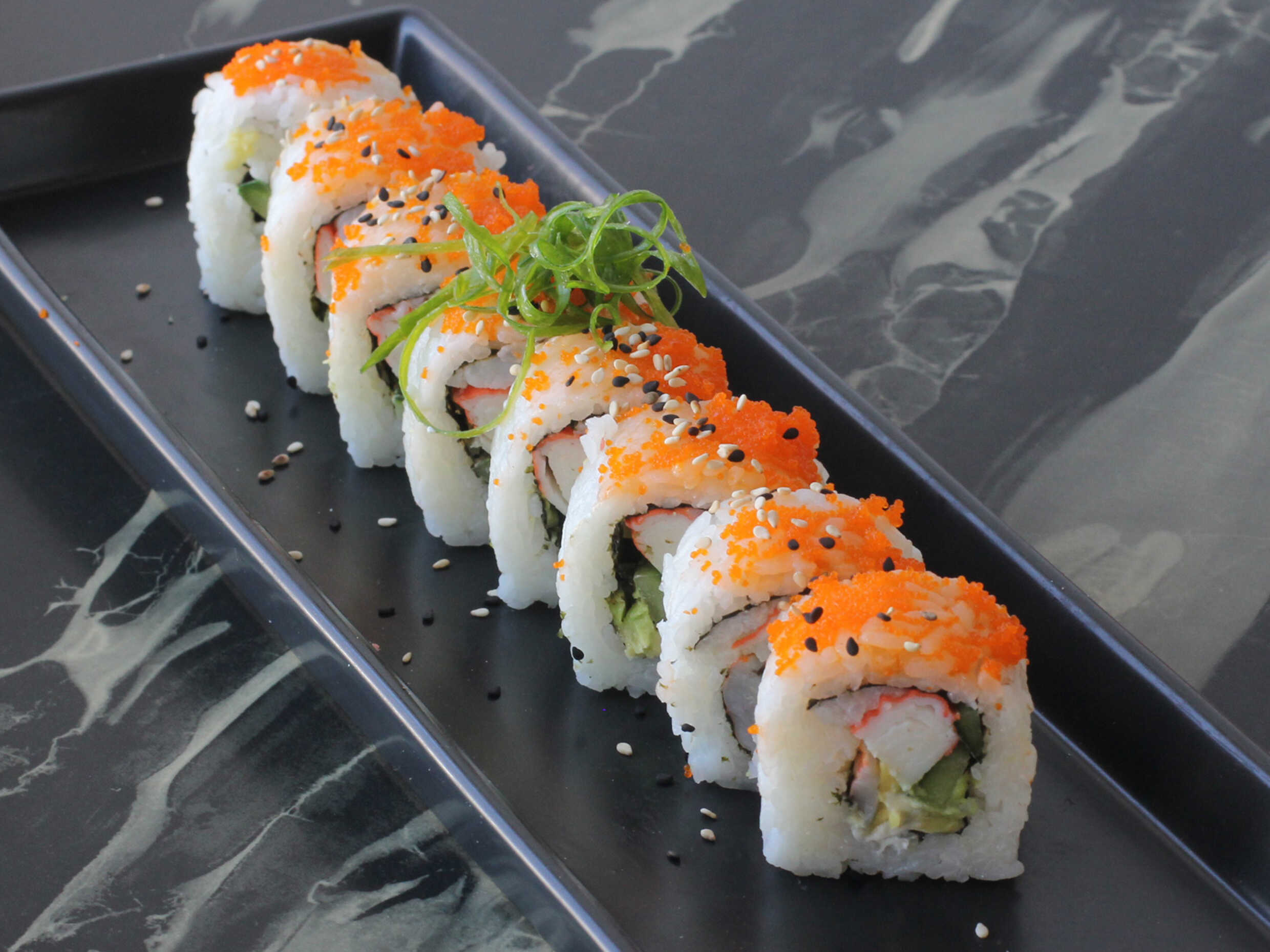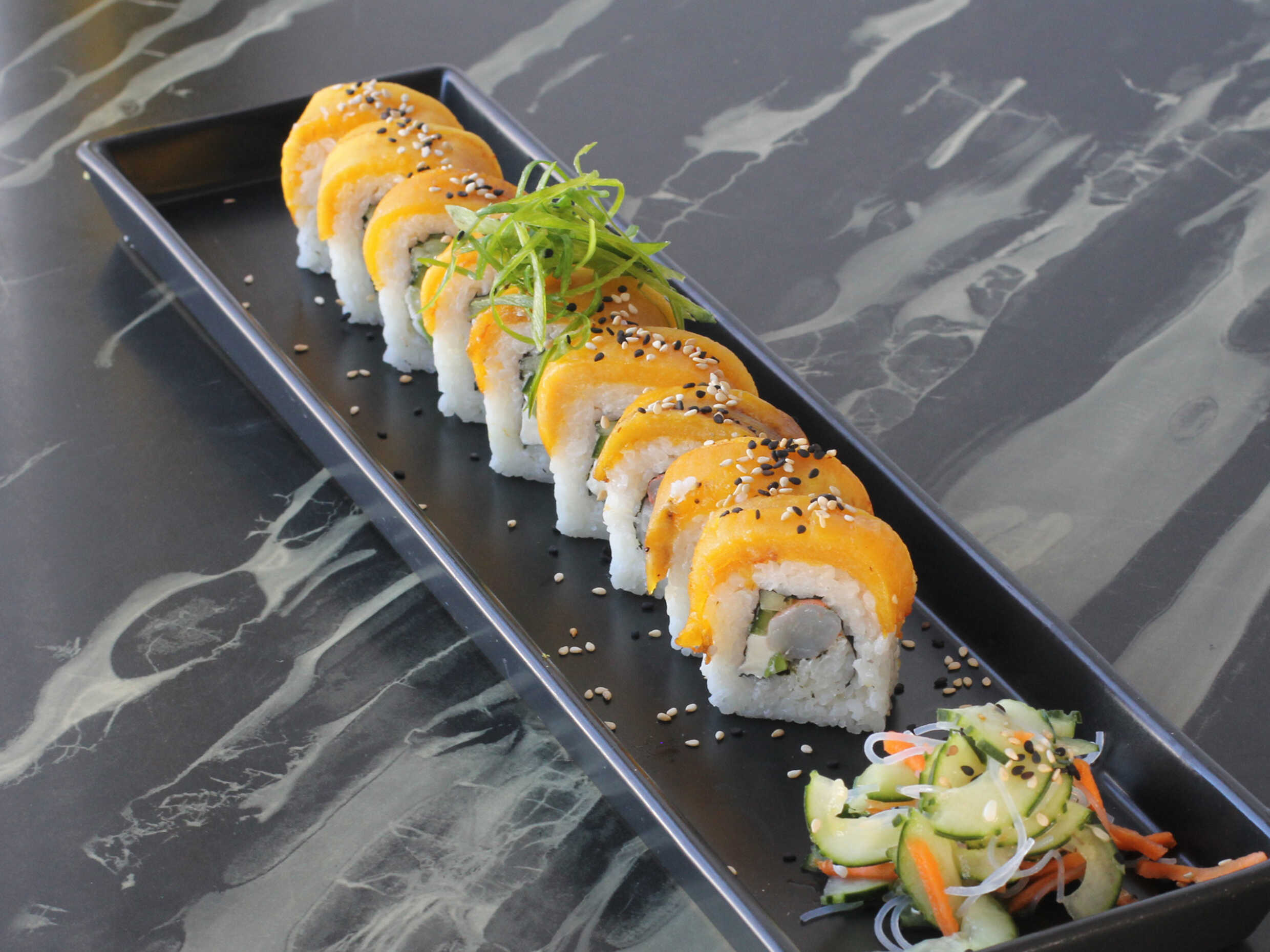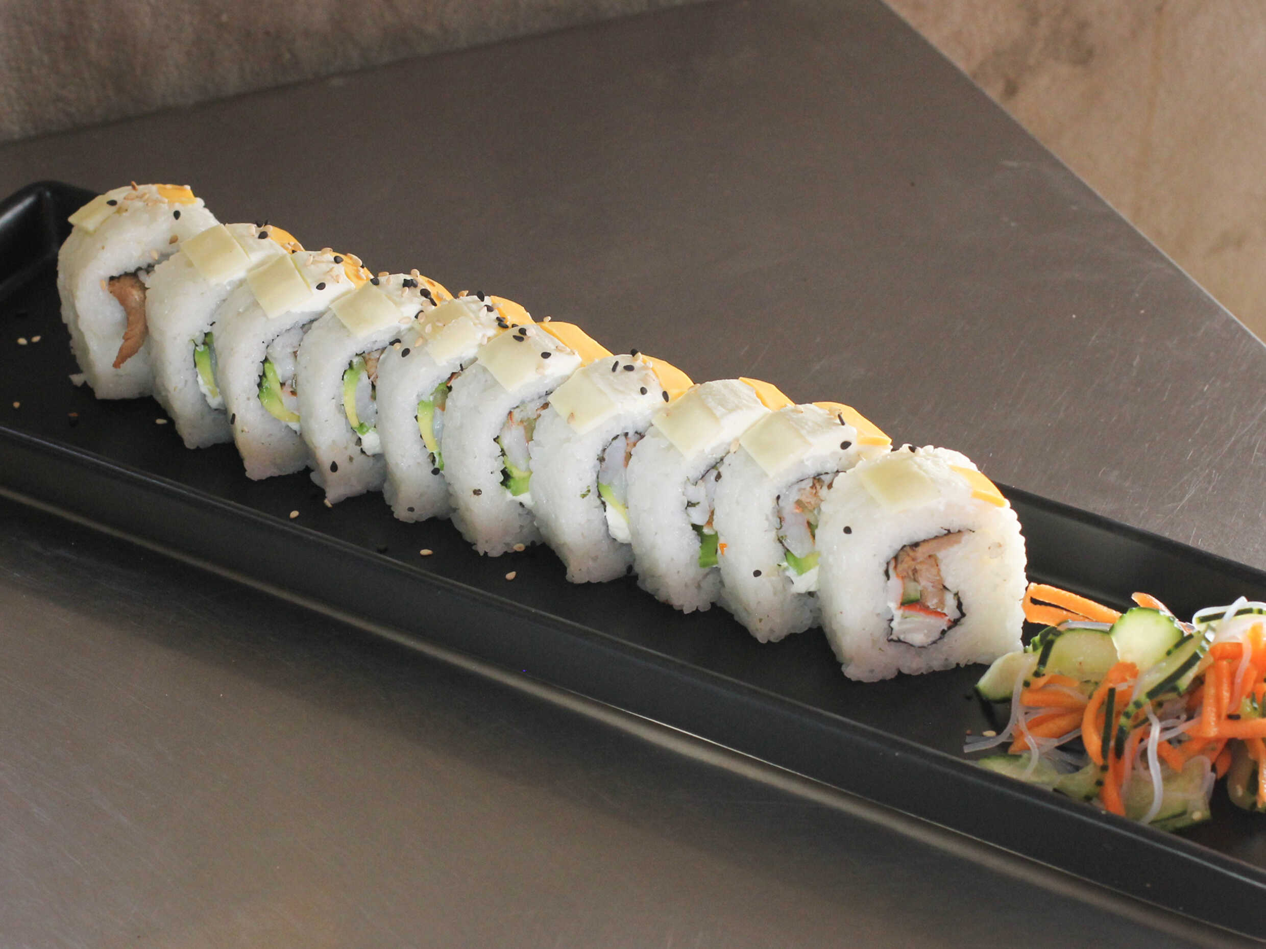 Surimi, forrado de aguacate con topping de Tampico. queso crema, pepino, aguacate y ajonjolí