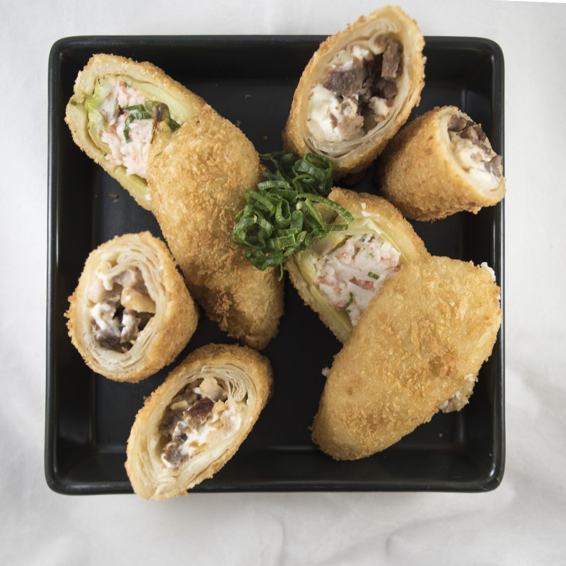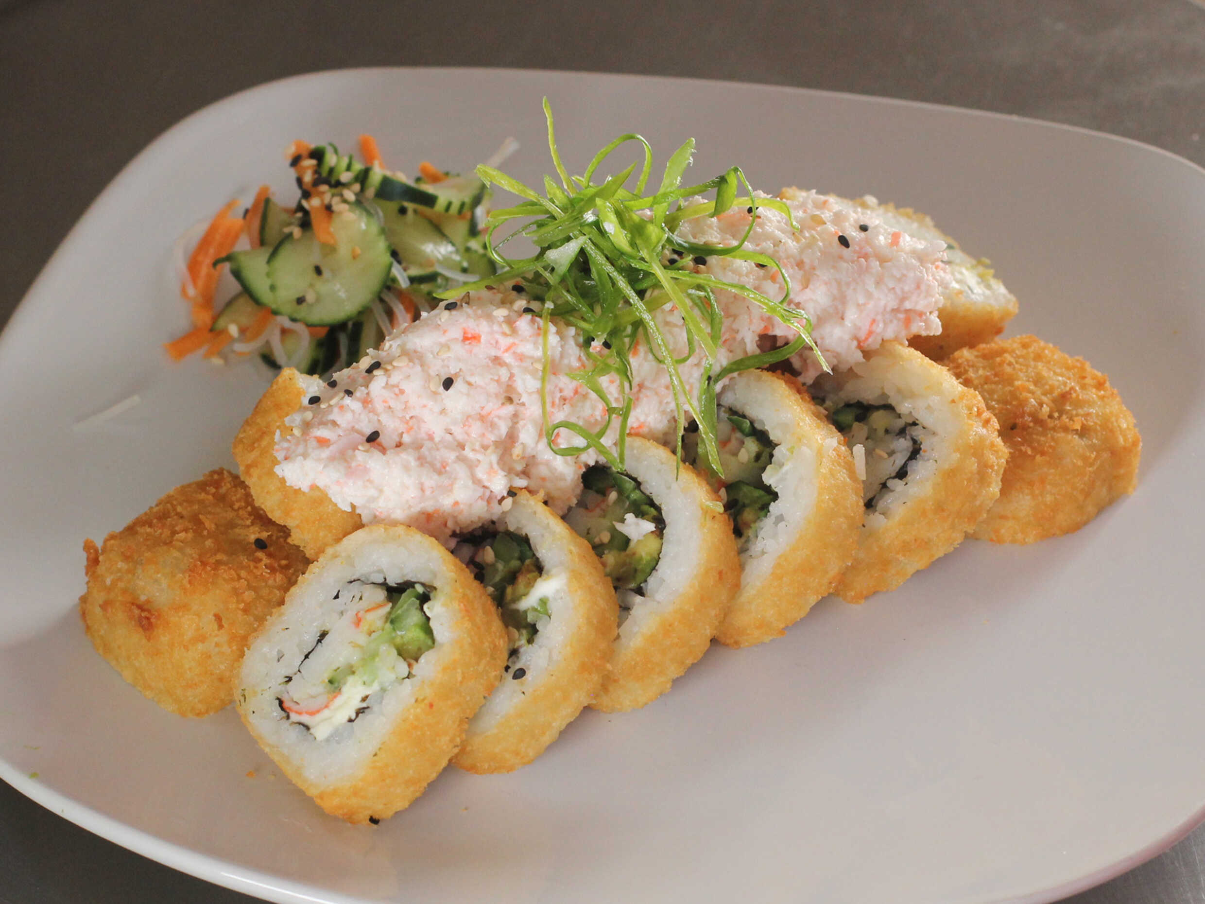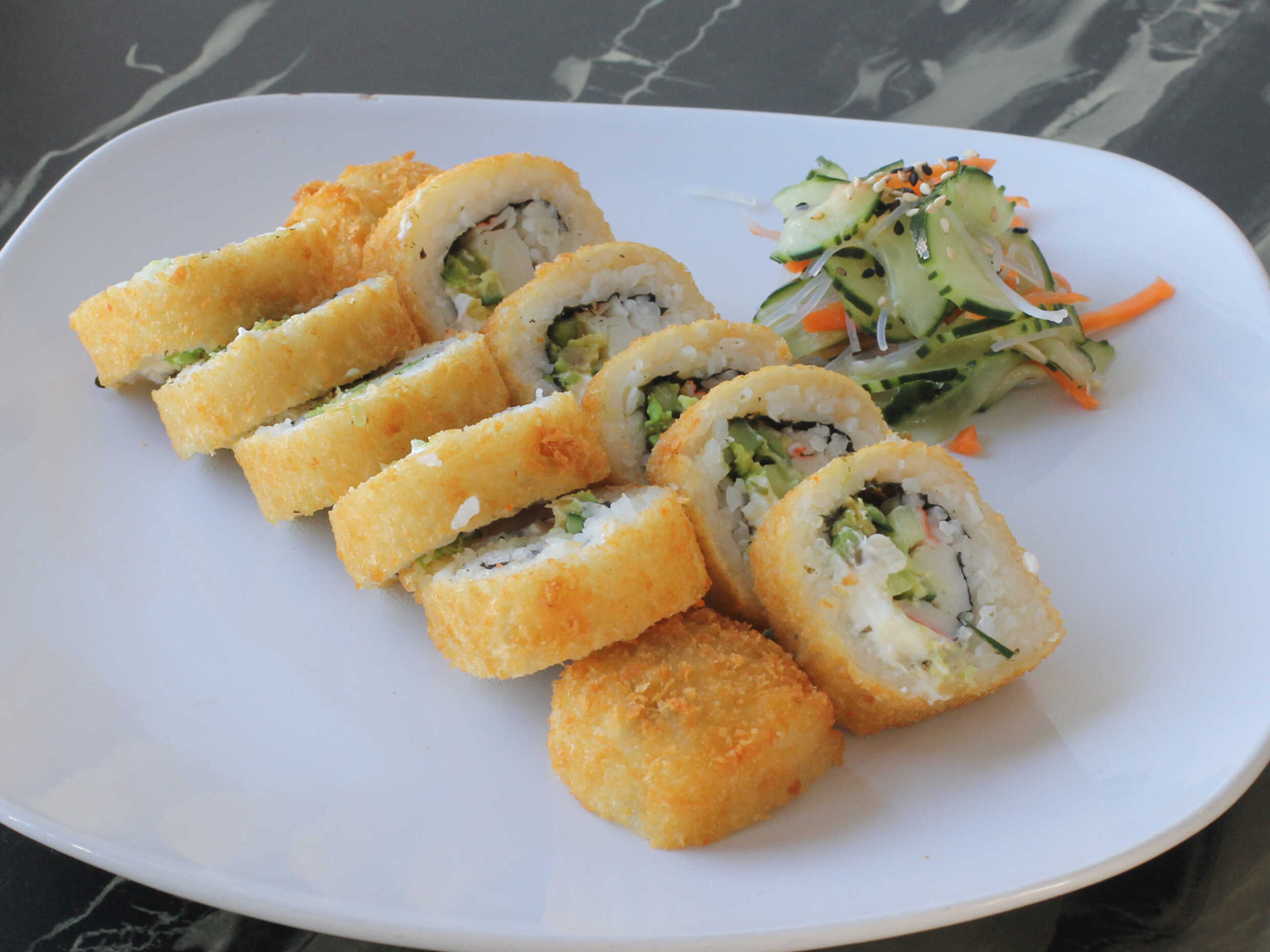 Camarón empanizado, forrado de plátano macho, queso crema, pepino, aguacate y ajonjolí.