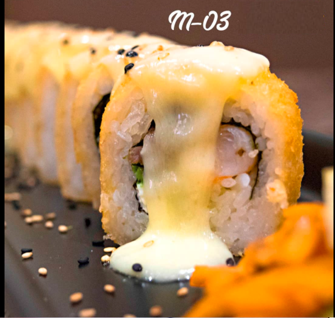 Camarón, res y pollo, queso crema, pepino, aguacate y ajonjolí.