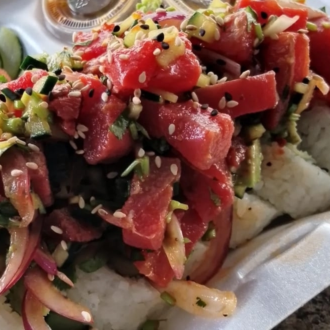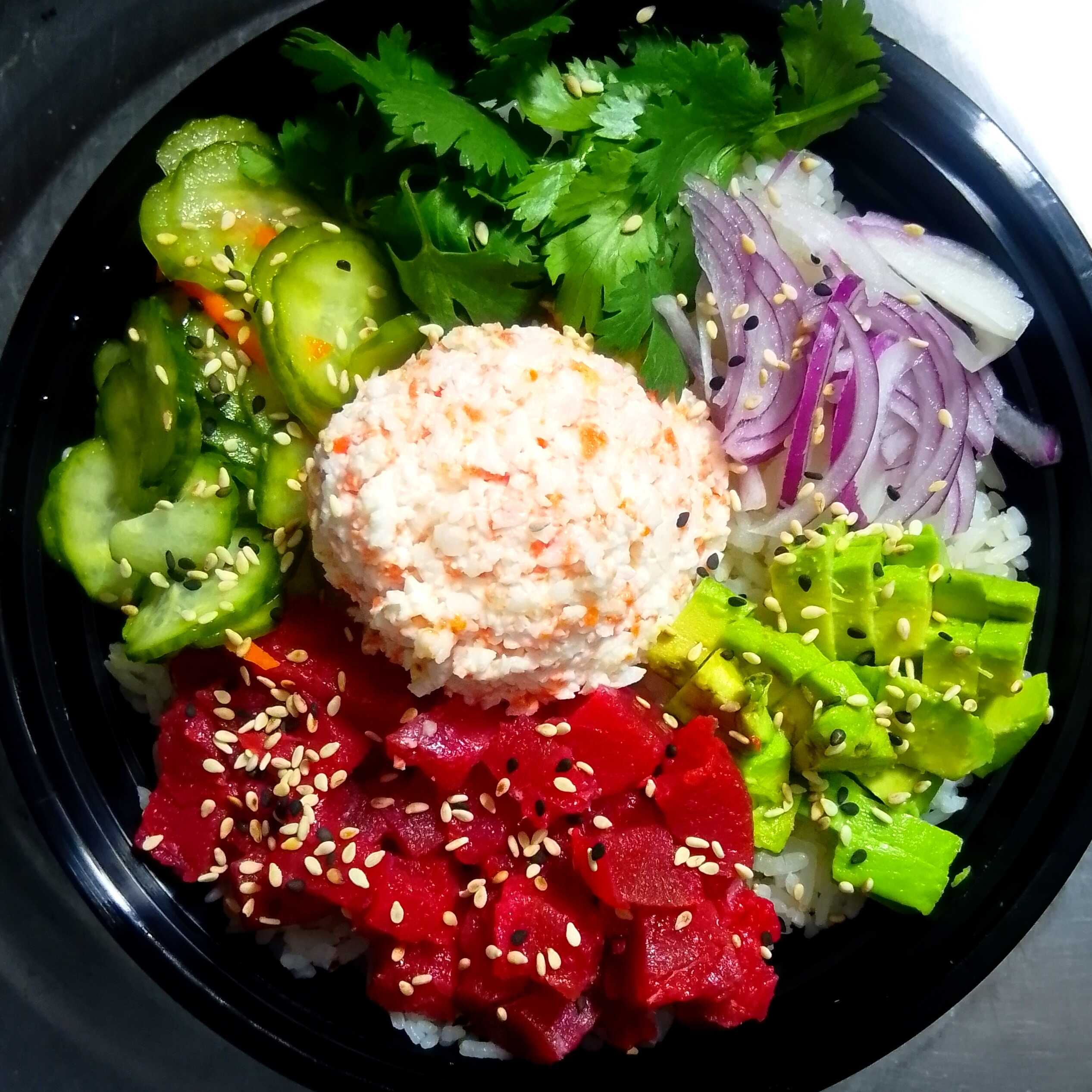 Base de arroz, atun preparado con ponzu de chile rocoto , cilantro, cebolla, pepino , aguacate