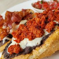 Pan bolillo con frijoles y queso derretido, salsa a escoger, queso cotija, crema, cebolla y cilantro.