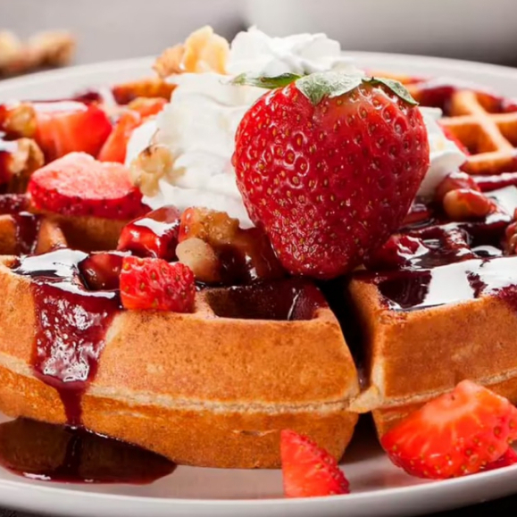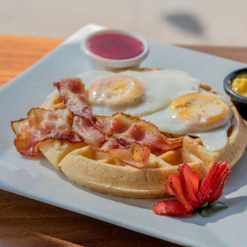 Waffle bañado de miel maple, plátano, fresa y frutos rojos, acompañado de 2 huevos, 2 salchichas y tocino.