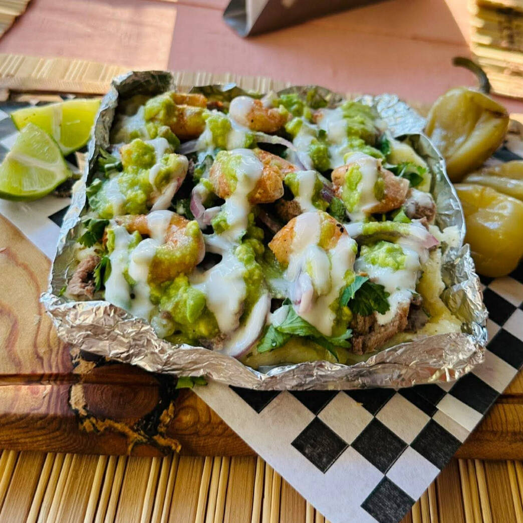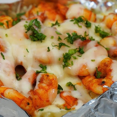 Bistec, camarón, pollito, chorizo, tocino, chile morrón y cebolla caramelizada, gratinada con queso monterrey acompañada con guacamole y totopos.