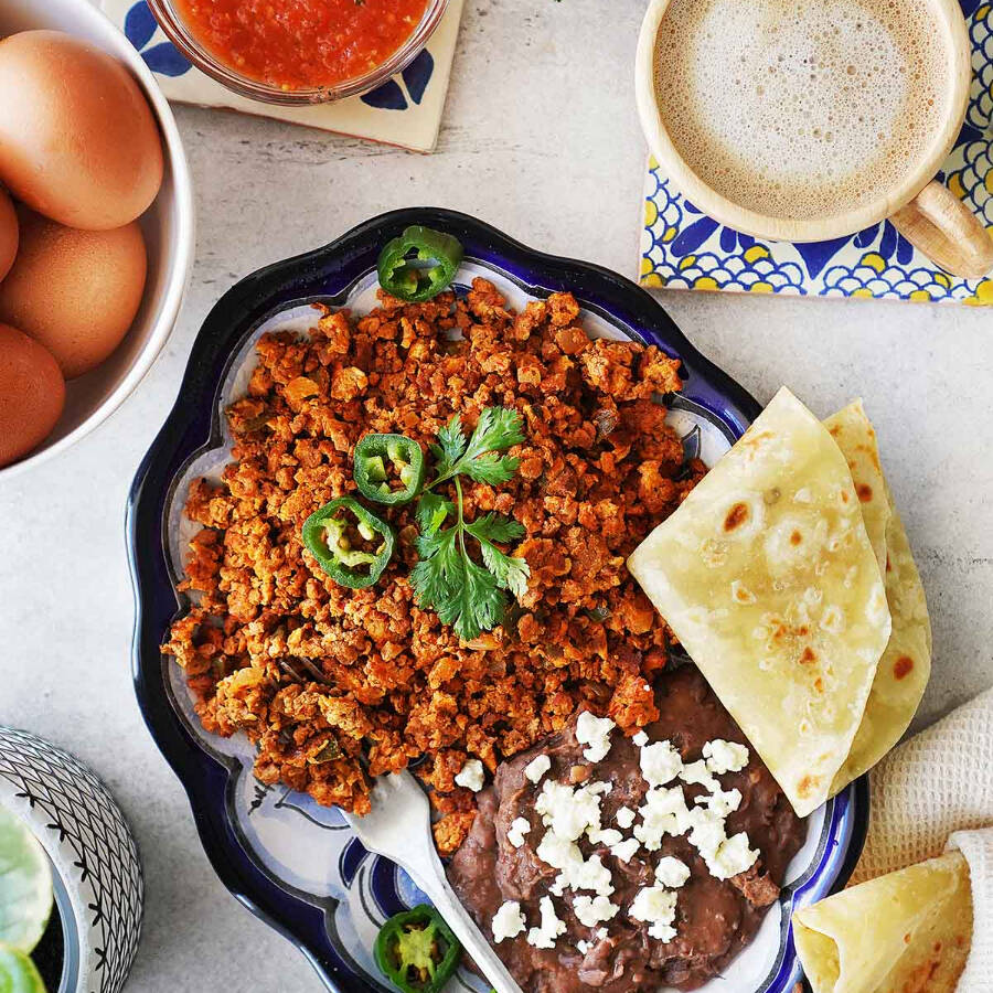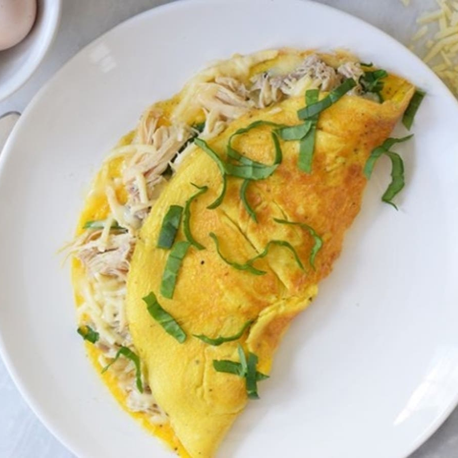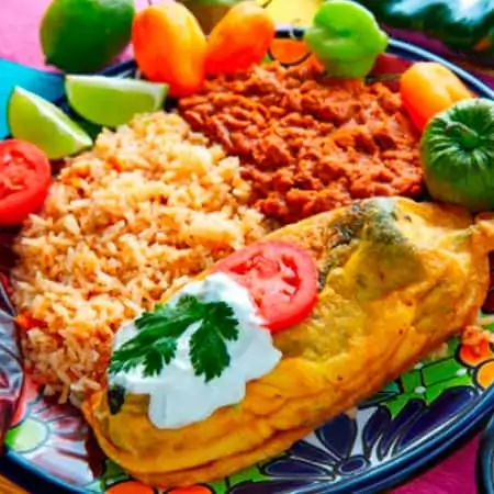 Huevo batido relleno de queso monterrey y proteína a elegir, acompañado de quesadilla y frijoles.