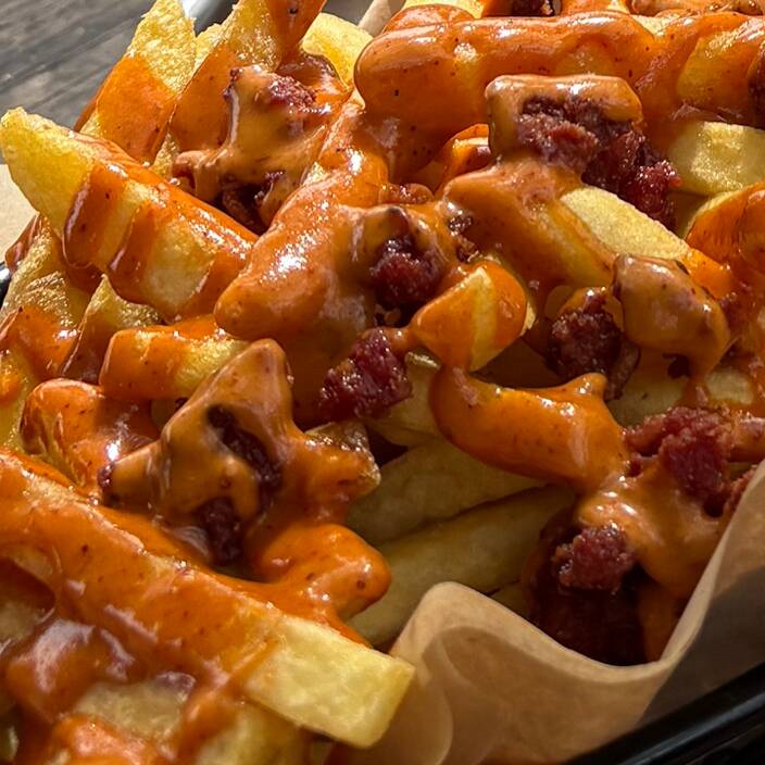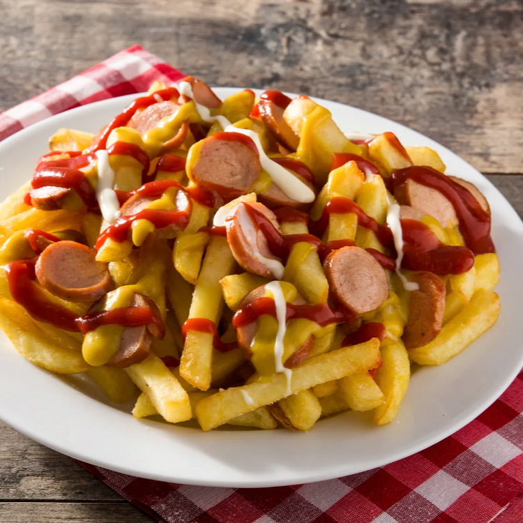 Trocitos de salchicha con papas a la francesa bañadas en queso cheddar