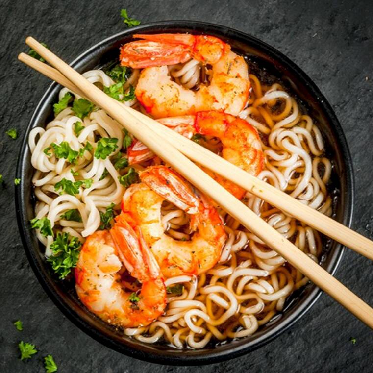 Ramen con camarón, pollo y chuleta de cerdo, cebollín y caldo de camarón especial.