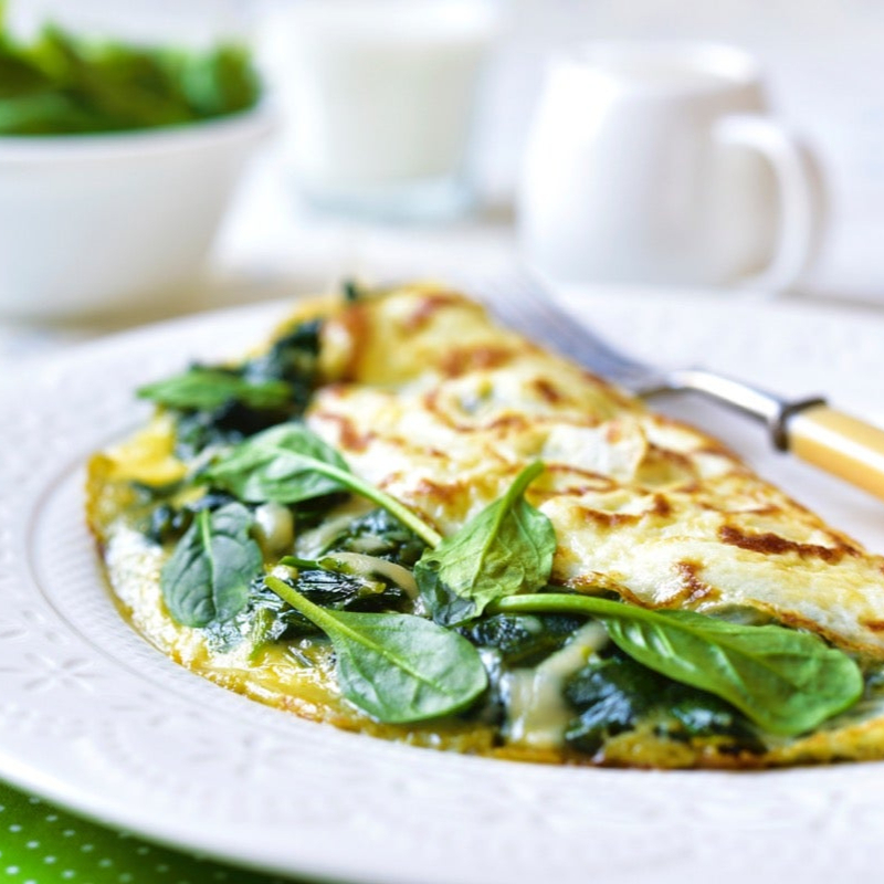 Saludable omelette relleno de queso monterrey, espinacas y champiñones, servido con quesadilla y frijoles.