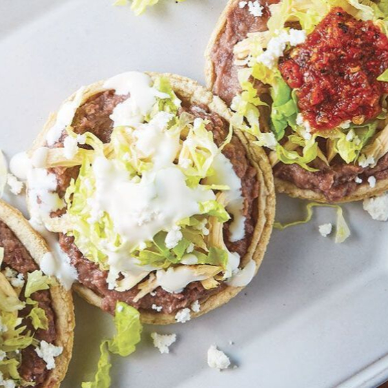 Orden de 3 sopes de pollo, deshebrada o chorizo, lechuga, crema, queso cotija y frijoles.