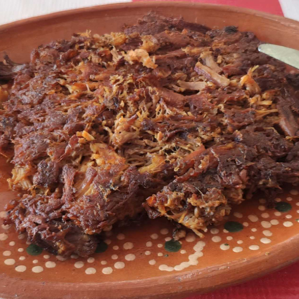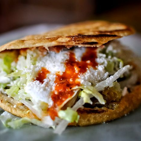 2 Gorditas de chicharrón prensado, acompañadas con lechuga, cilantro, cebolla, crema, queso Cotija, salsa y una guarnición de frijoles.