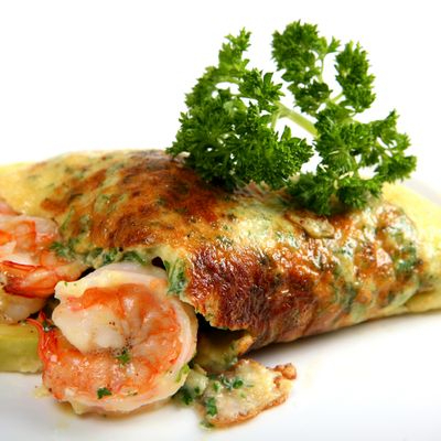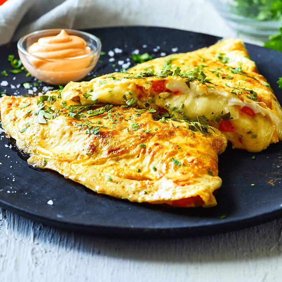 Exquisito omelette relleno de queso monterrey y camarones a la mantequilla, acompañado de quesadilla y frijoles.