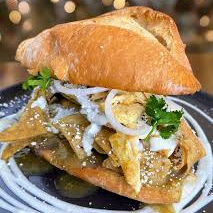 Bolillo con chilakiles en salsa a escoger, acompañados con huevo, proteína a elegir, queso monterrey, queso cotija, crema, cebolla, cilantro y frijoles.