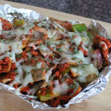 Bistec, chorizo, champiñones, chile morrón y cebolla caramelizada, gratinada con queso monterrey acompañada con guacamole y totopos.