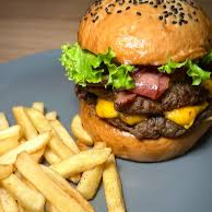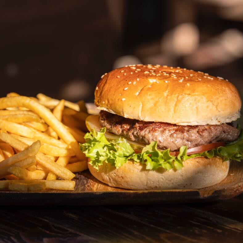 Carne de res, queso americano, lechuga, tomate, cebolla, pepinillos, acompañado con papas.