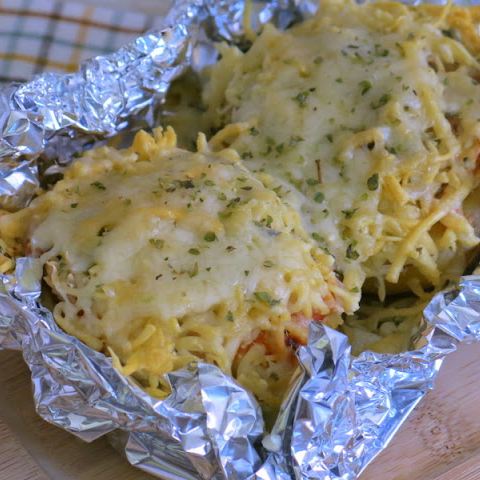 Pollito, tocino, champiñón, cebolla caramelizada, gratinada con queso monterrey acompañada con guacamole y totopos.