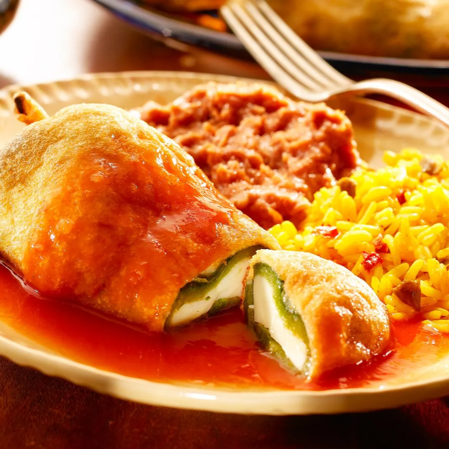 1 chile relleno de queso gratinado bañado en salsa de la casa, acompañados con arroz, frijoles tortillas.