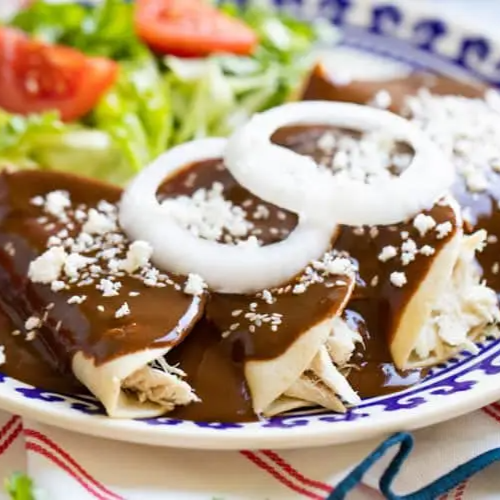 Orden de 3 enmoladas de pollo, crema, cebolla morada, queso cotija y frijoles.