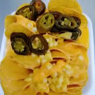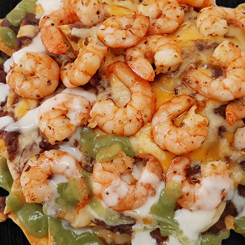 Crujiente totopo, queso cheddar, camarón, guacamole con pico de gallo y jalapeños.