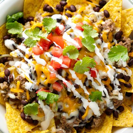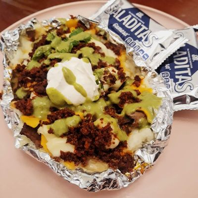 Crujiente totopo, queso cheddar, bistec, guacamole con pico de gallo, queso monterrey, crema y jalapeños