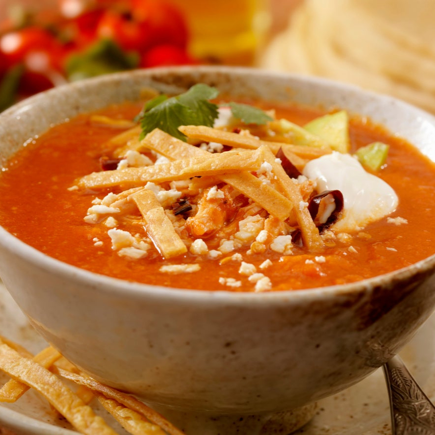 Caldo de tomate con pollo, queso fresco, aguacate y crema.