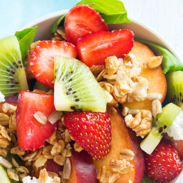 Mezcla de frutas de temporada con queso cottage, miel y granola.