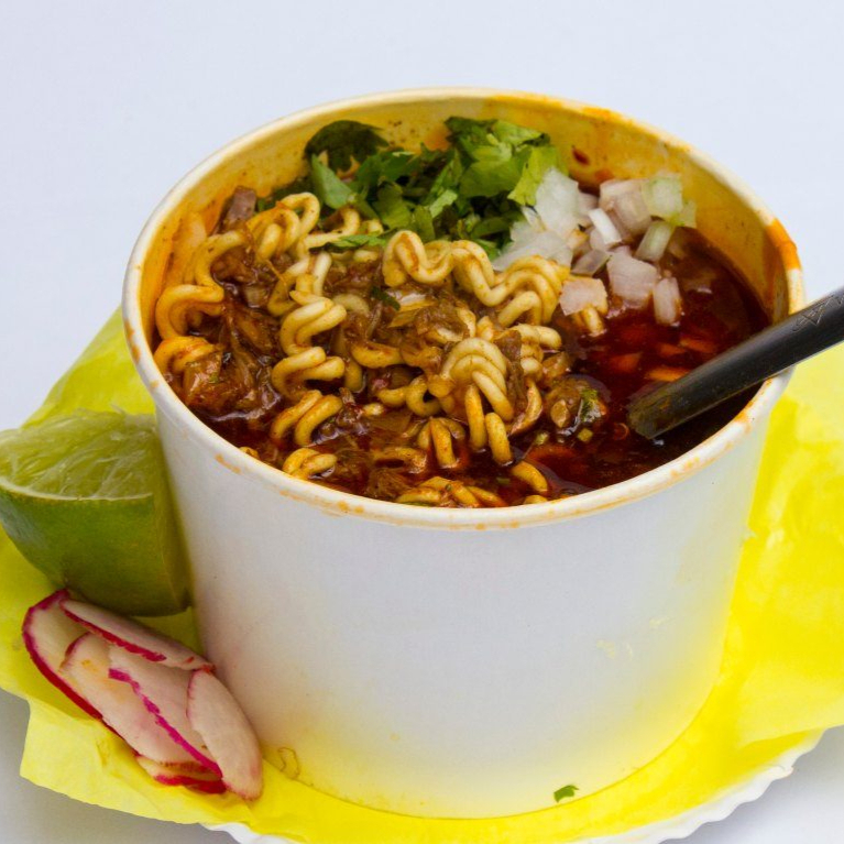 Fusión de ramen con el sabor tradicional de la birria de la casa.