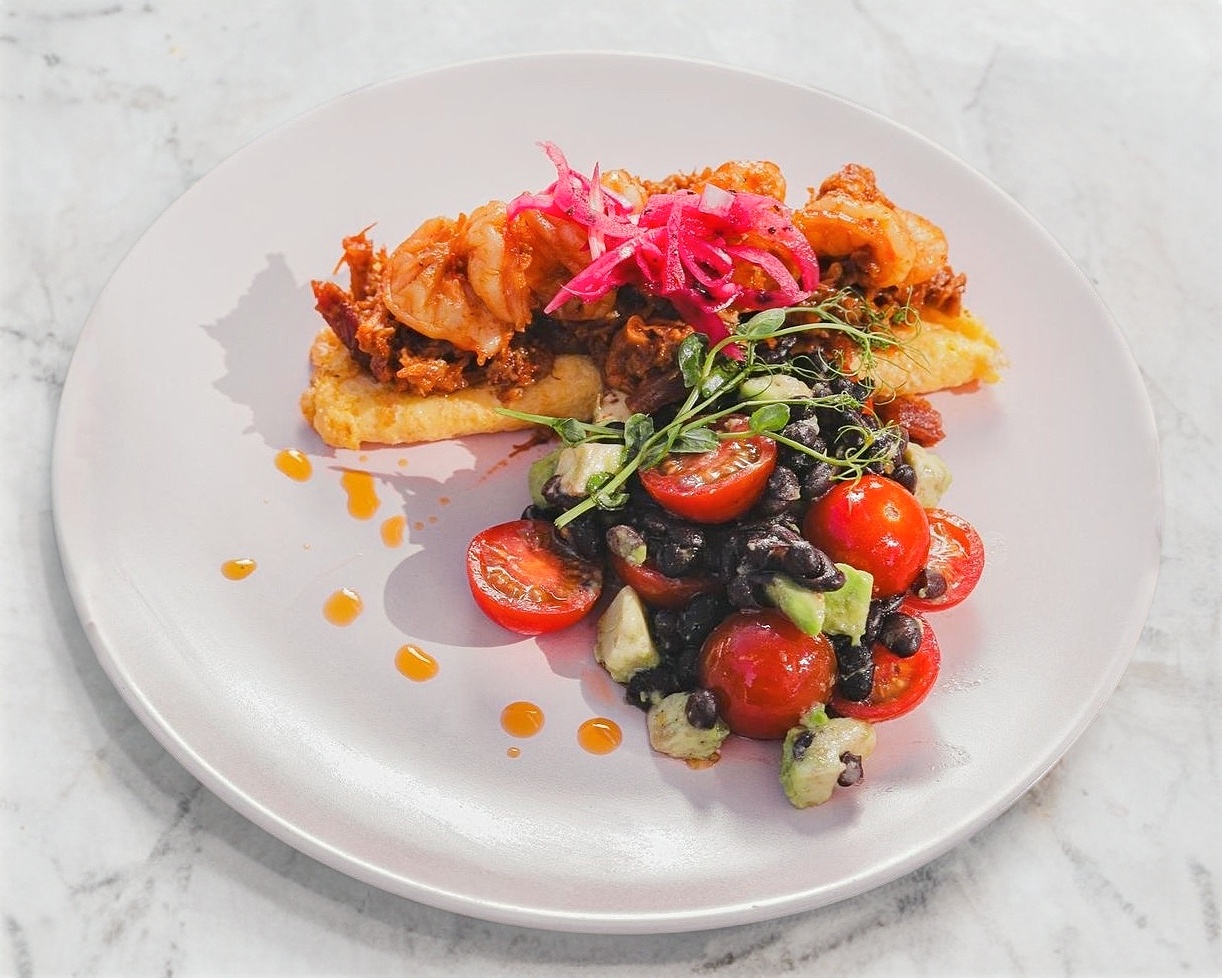 Camarón, chicharrón prensado, ensalada fria de frijol negro, tomate cherry, aguacate, aceite de chiles y encurtido de la casa. 1 pieza
