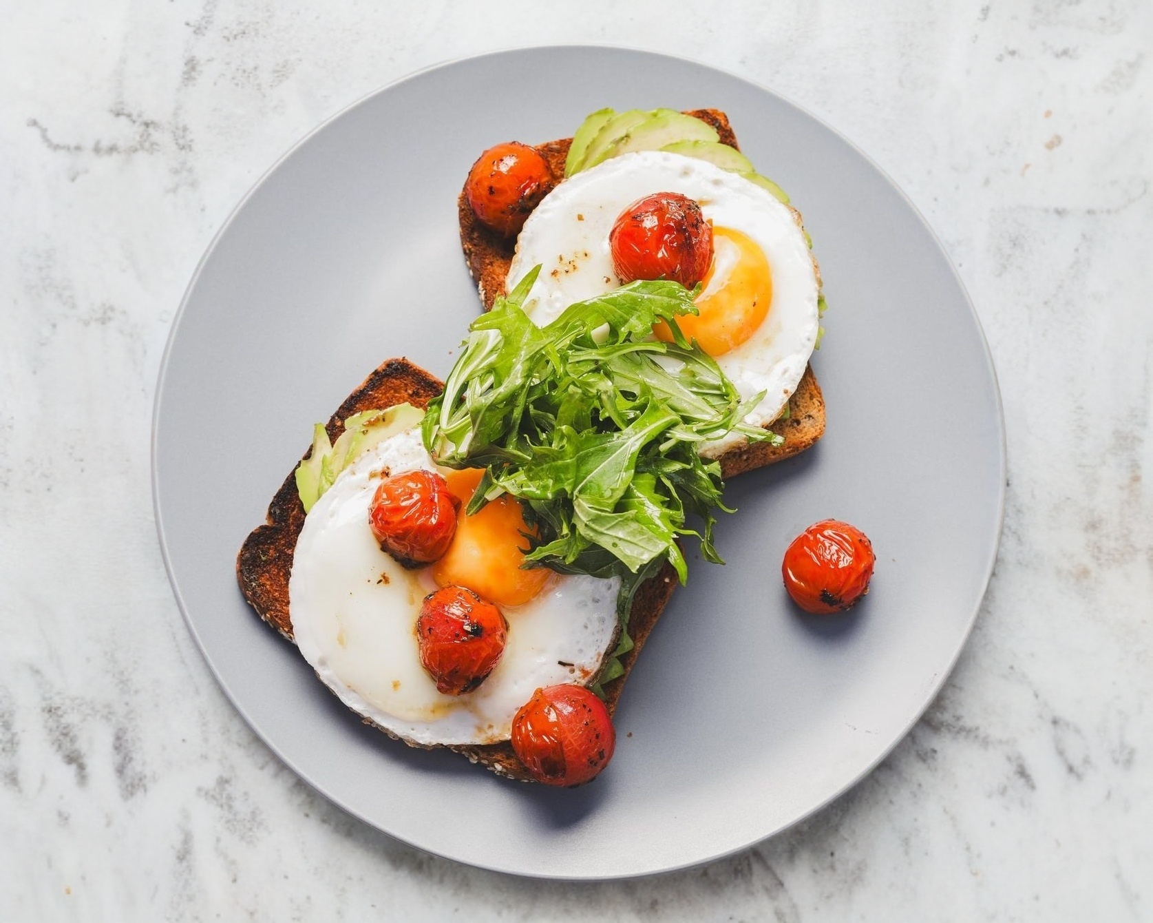 Con 2 huevos estrellados o revueltos y tomate cherry confitado.