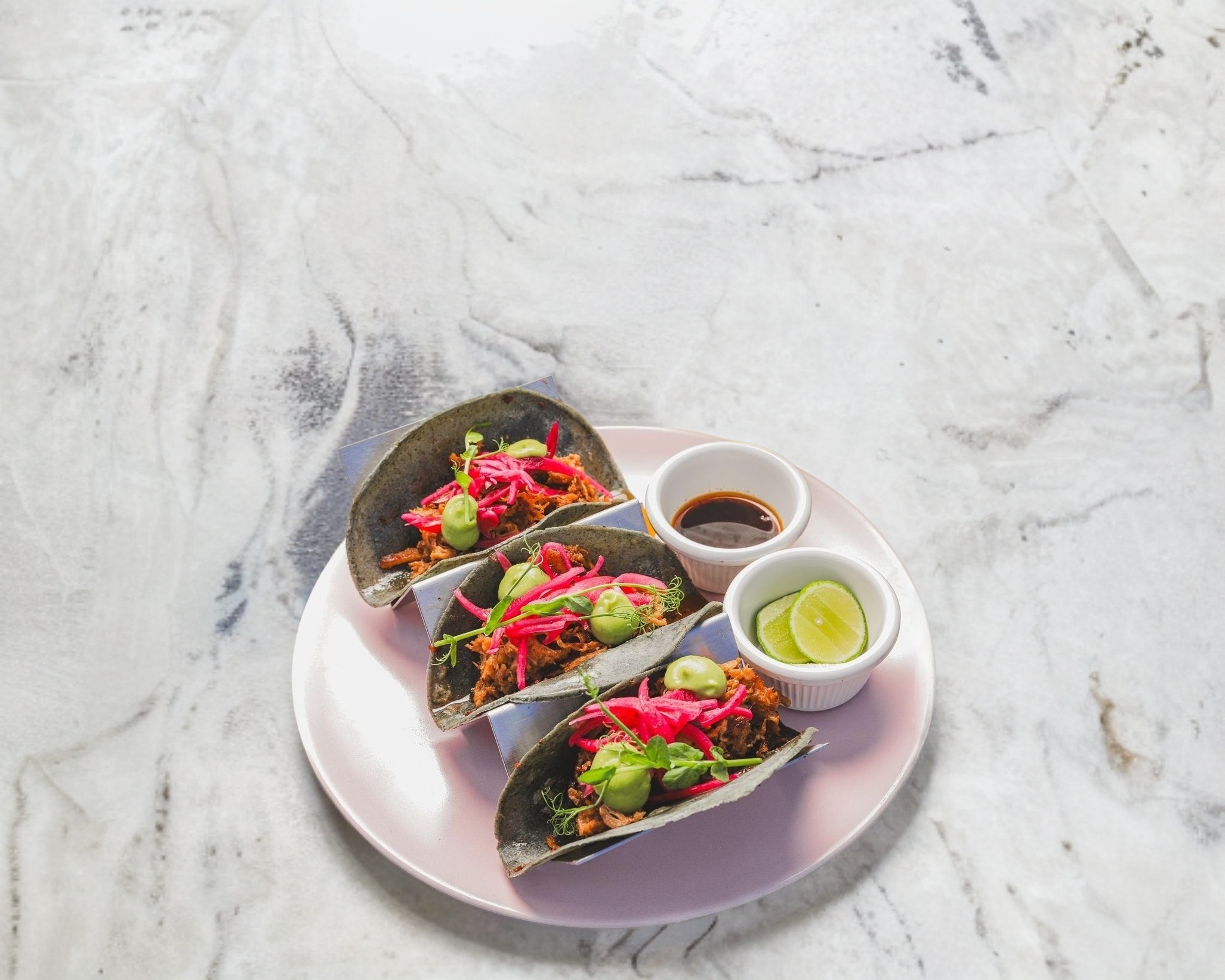 Tortilla de maóz azul, carnitas de lechón, mousse de aguacate, encurtido y salsa de la casa.