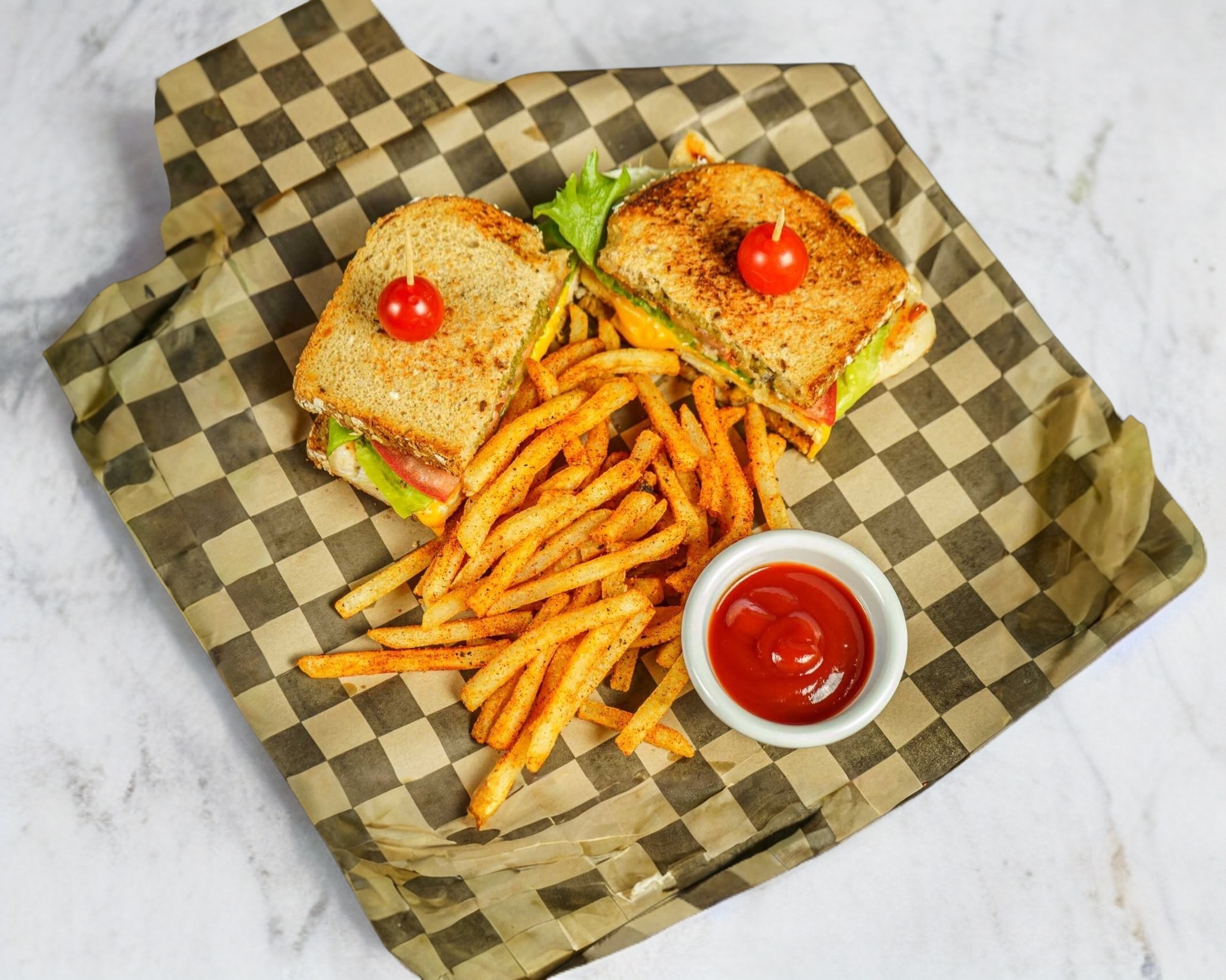 Pechuga de pollo, lechuga, tomate, queso amarillo y pesto de albahaca.