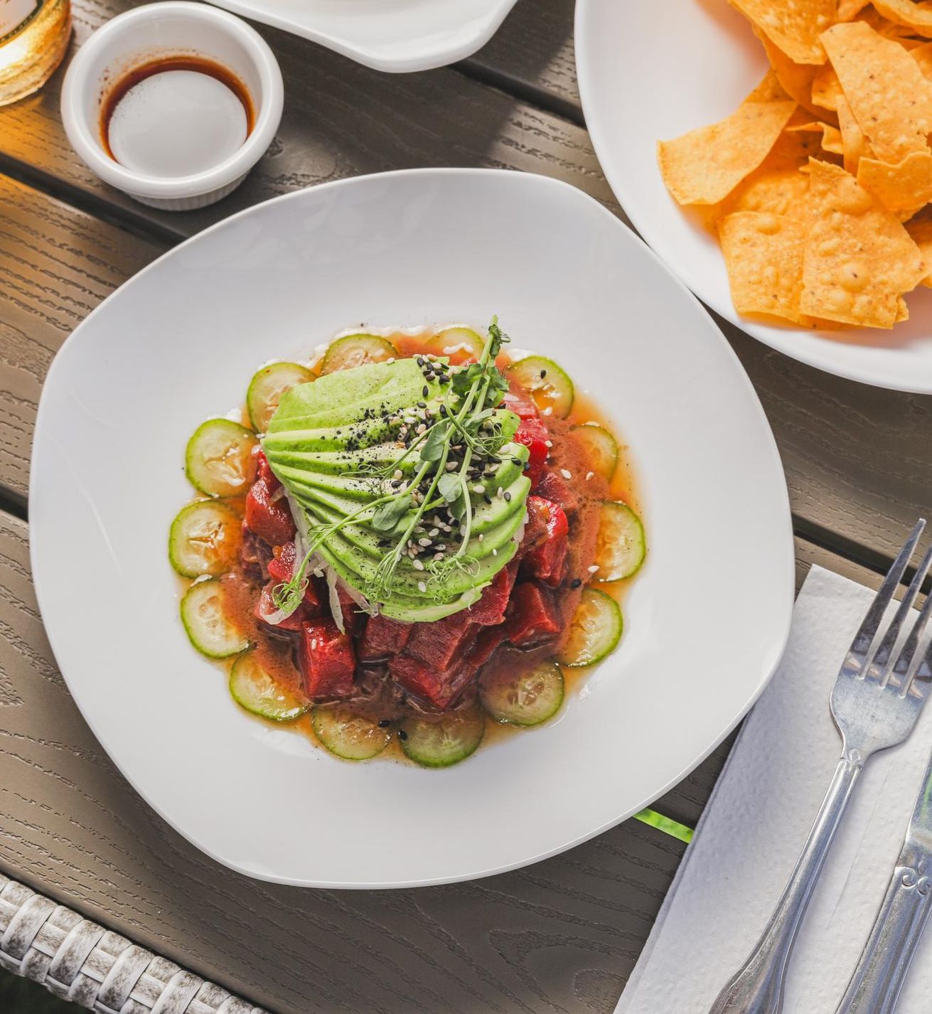 Atún azul, salsa oriental de la casa, mousse de aguacate y pepino.