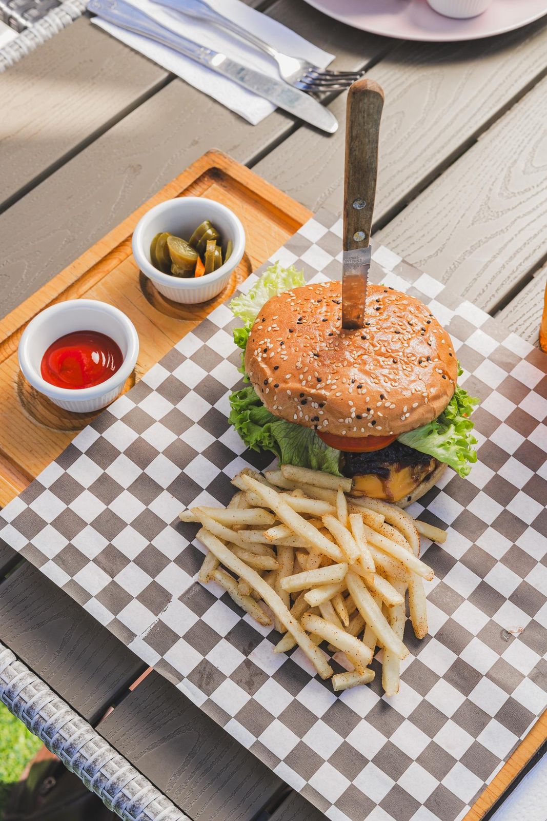 Carne de res, queso amarillo, lechuga, tomate, cebolla caramelizada en vino tinto acompañada de papas fritas.