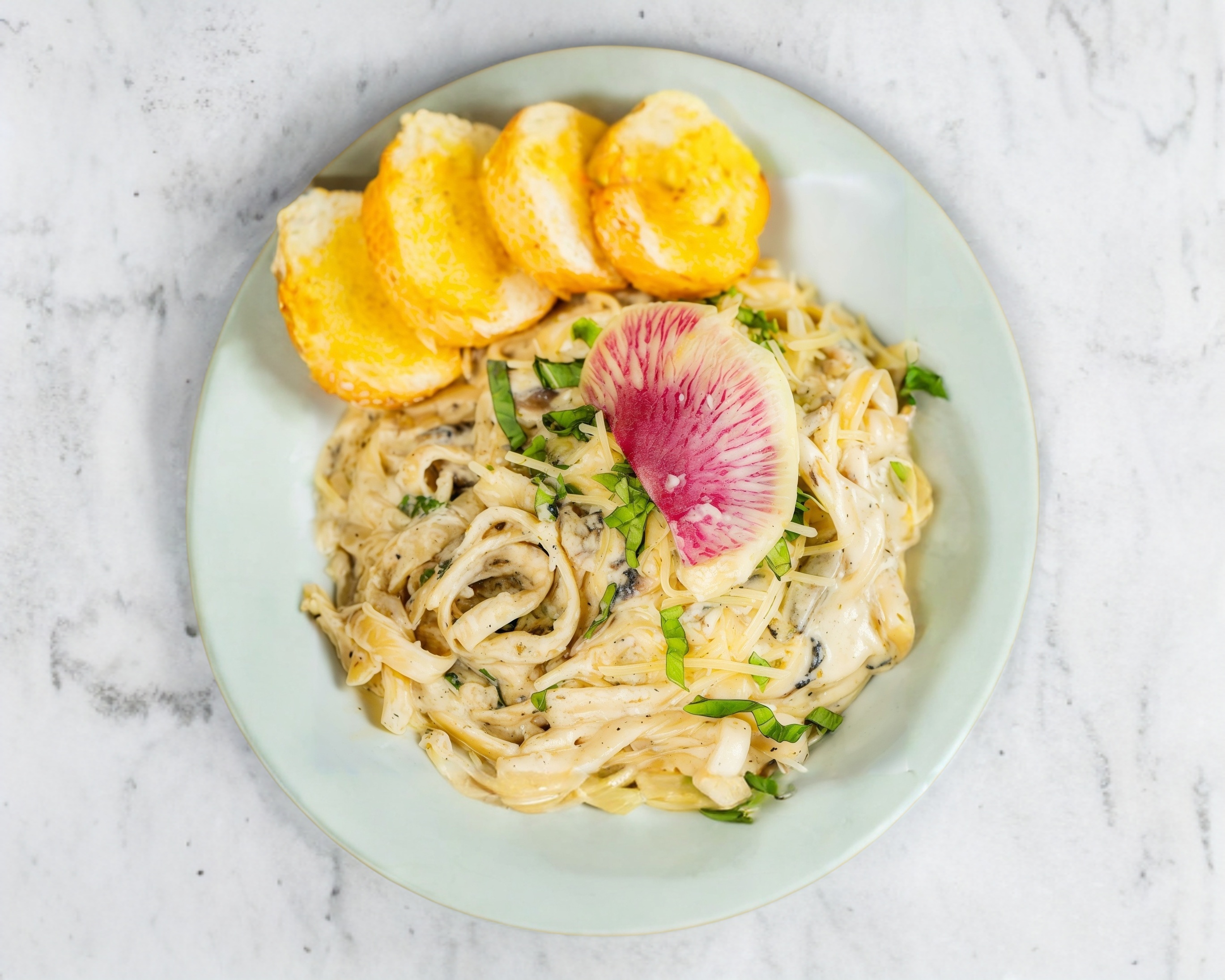 Con albahaca fresca, parmesano y pollo.