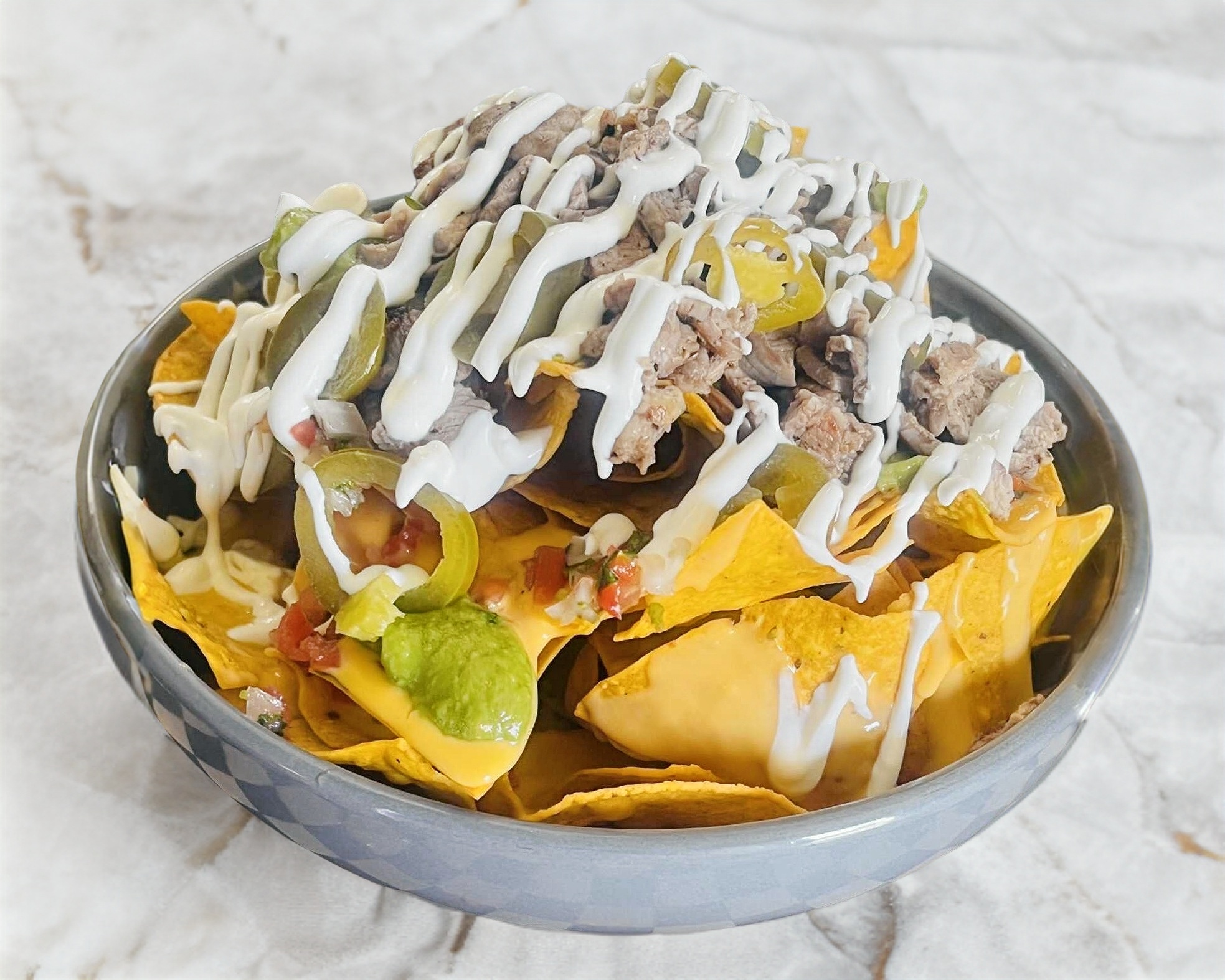 Queso amarillo, salsa bandera, crema, guacamole y carne asada.