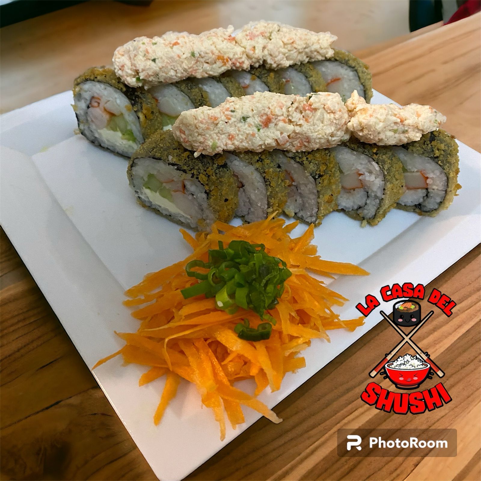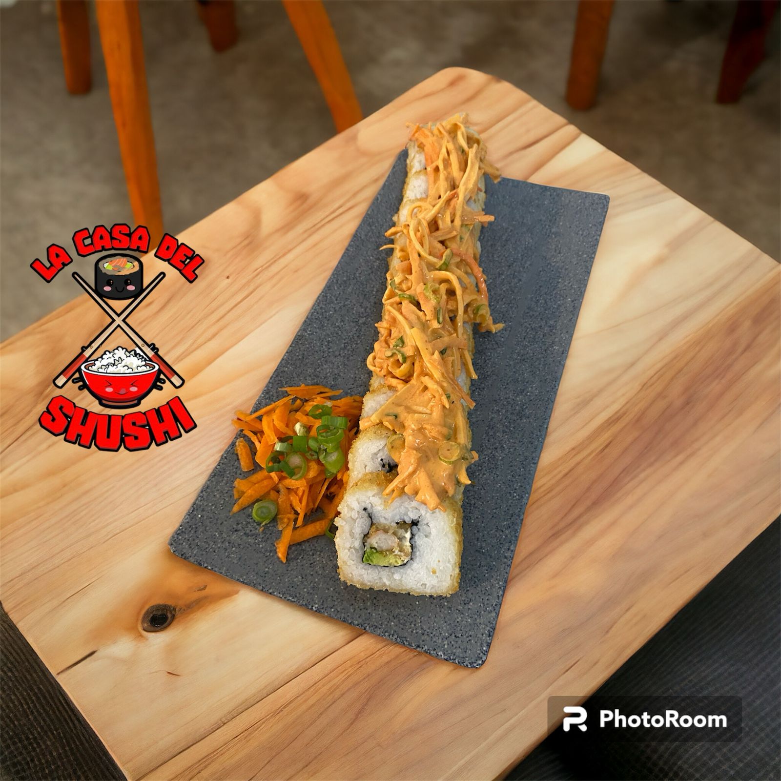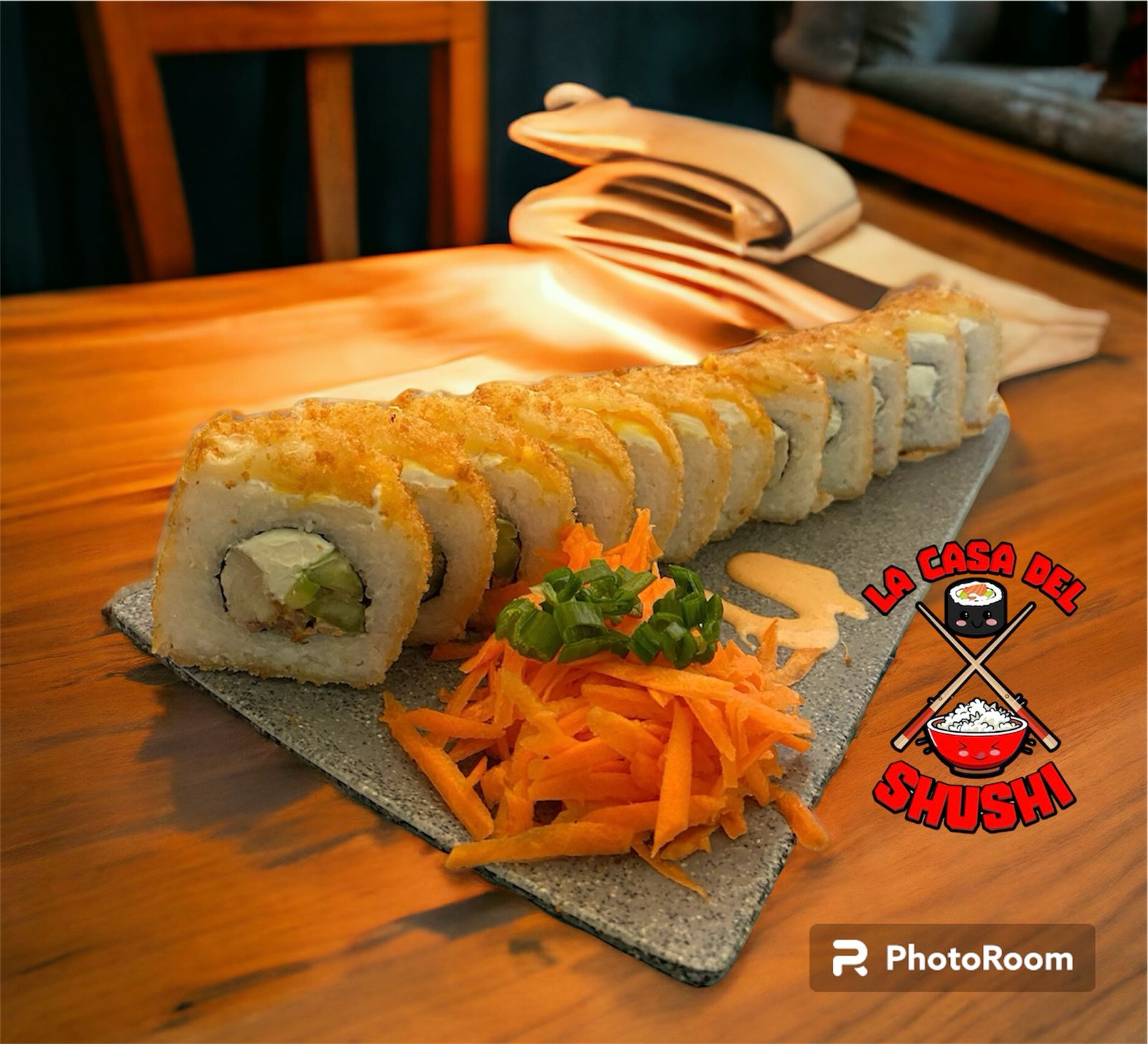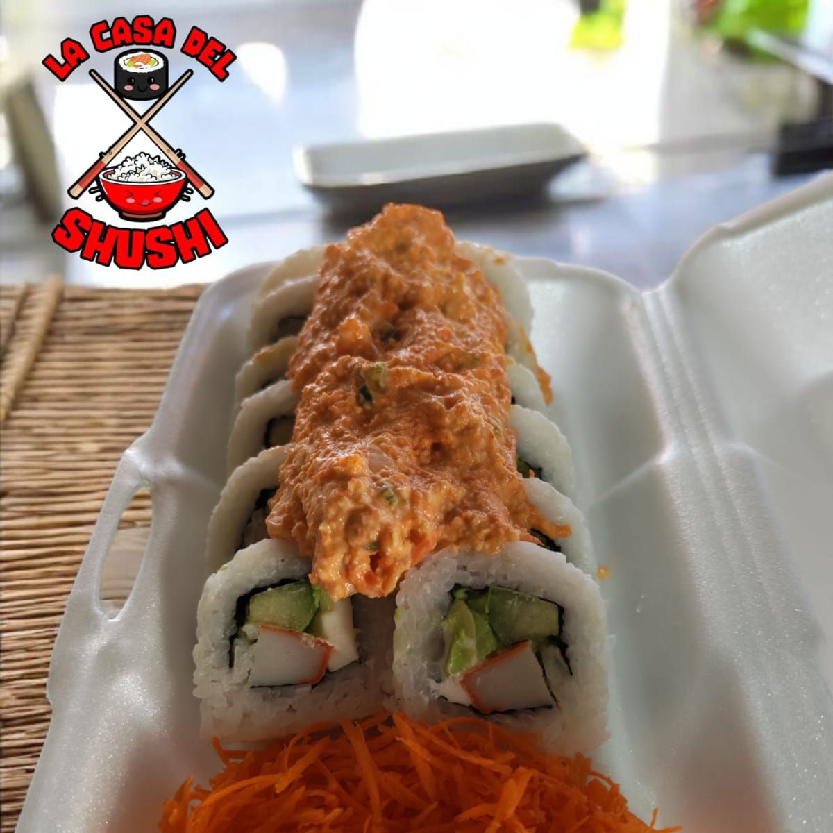 Philadephia, aguacate, pepino, surimi empanizado con toping de Tampico spisy (picosito)