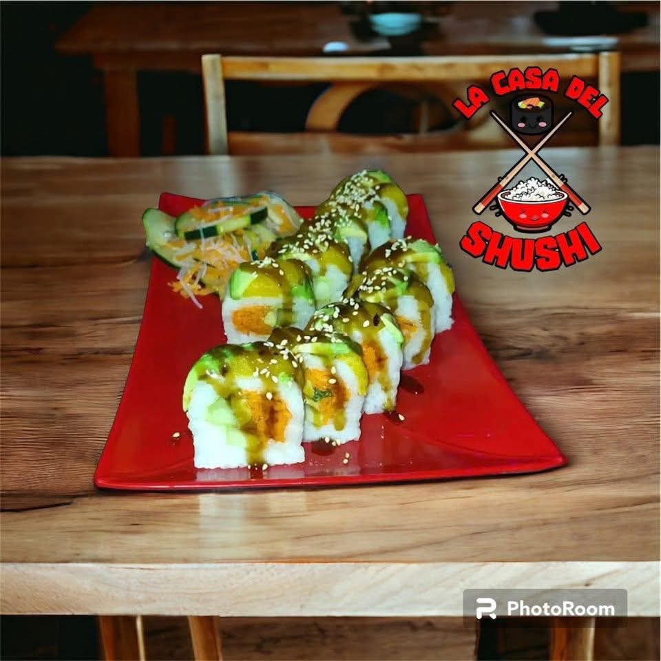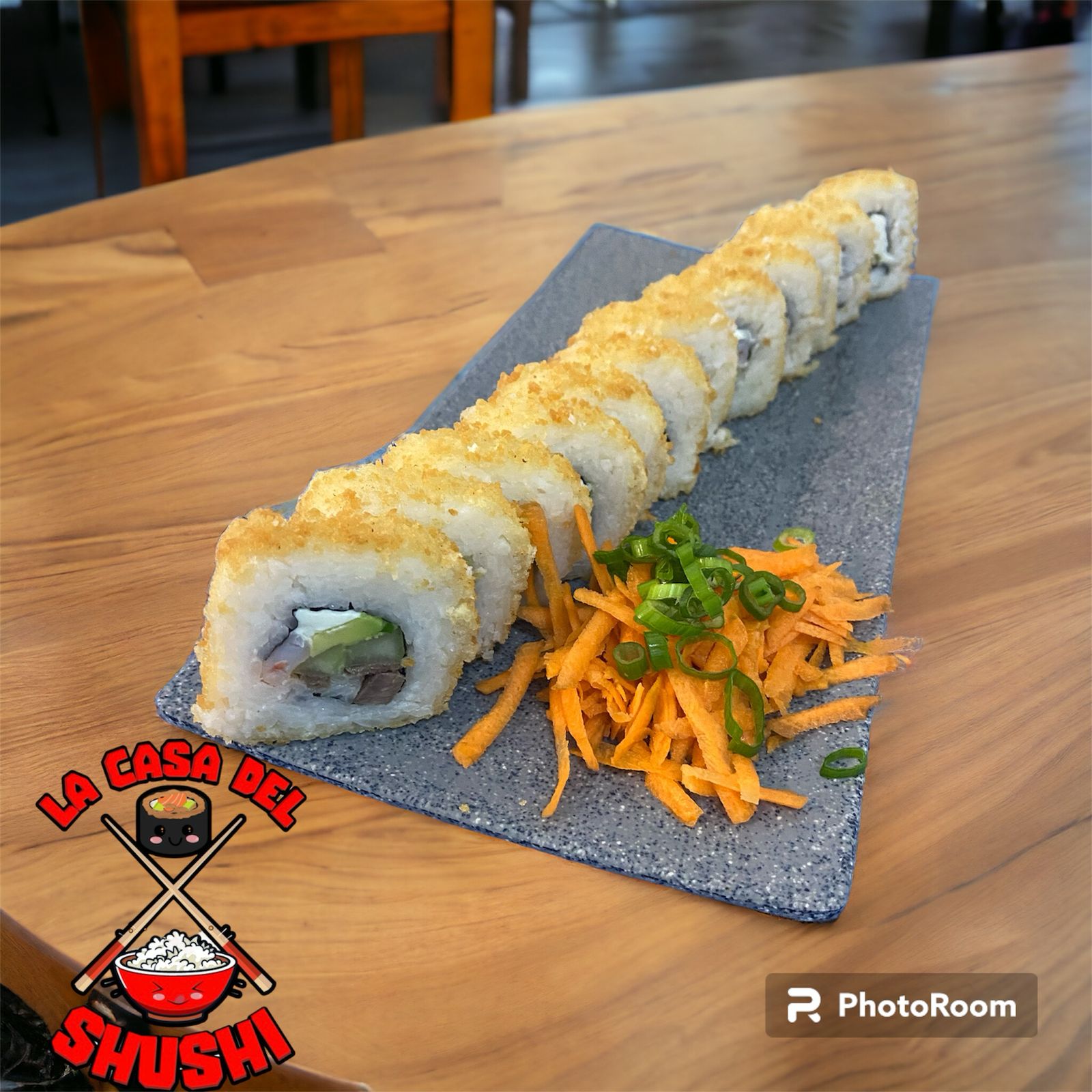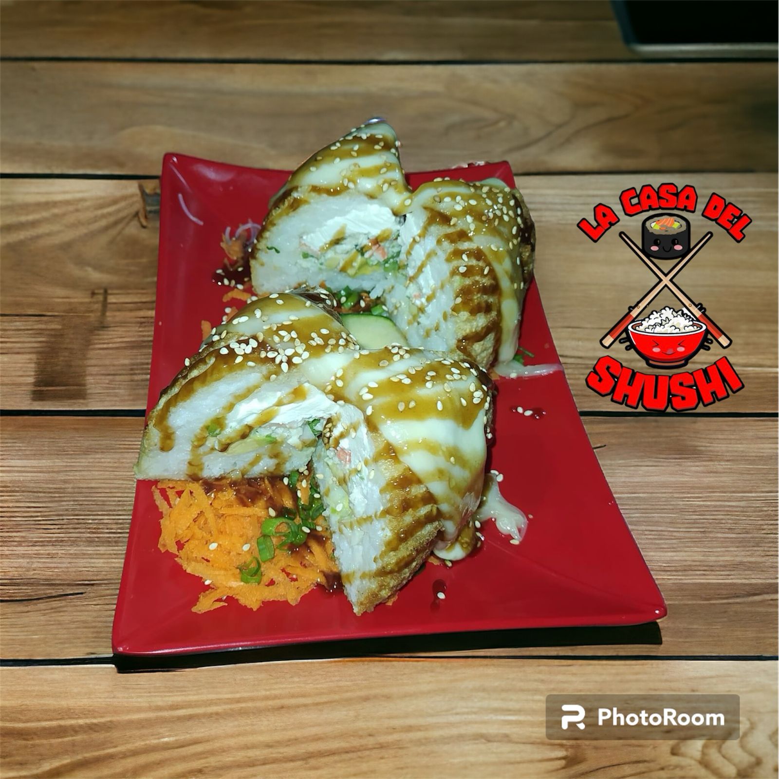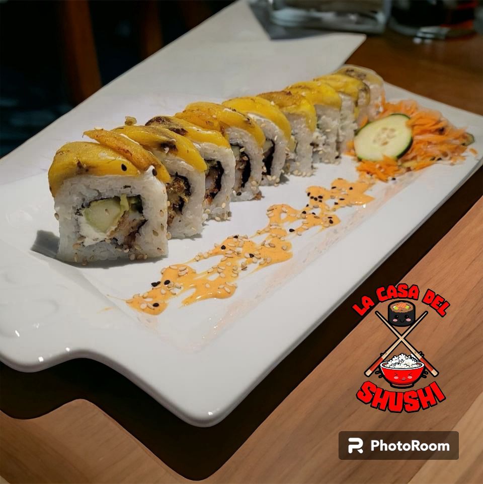 Phila, aguacate, pepino, camarón empanizado, cubierto de plátano macho frito y bañado con salsa anguila