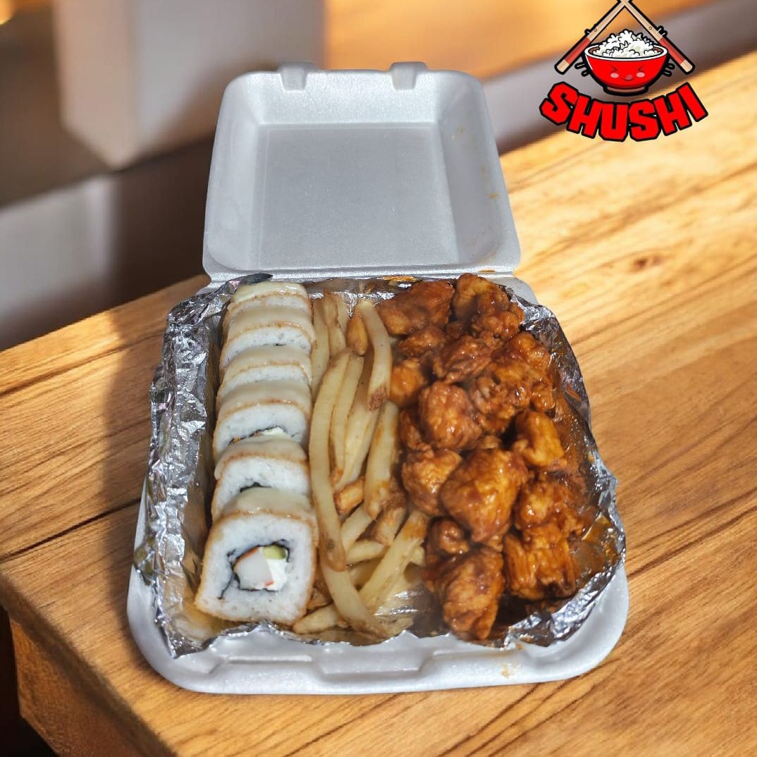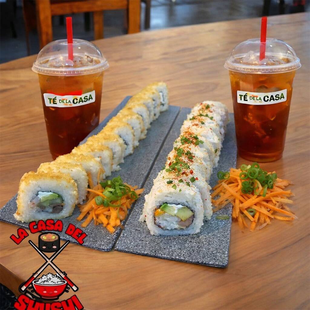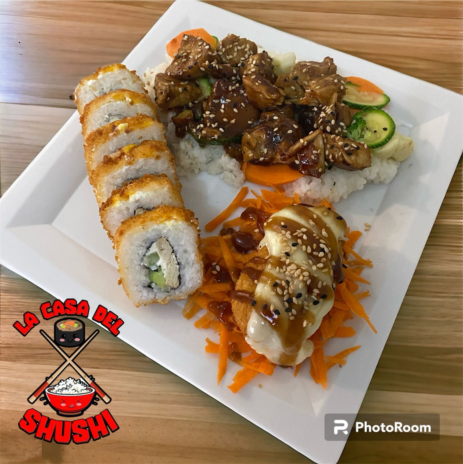 Medio rollo a elegir, medio teriyaki de pechuga de pollo, chilito de philadephia o camarón acompañado con un te de la casa