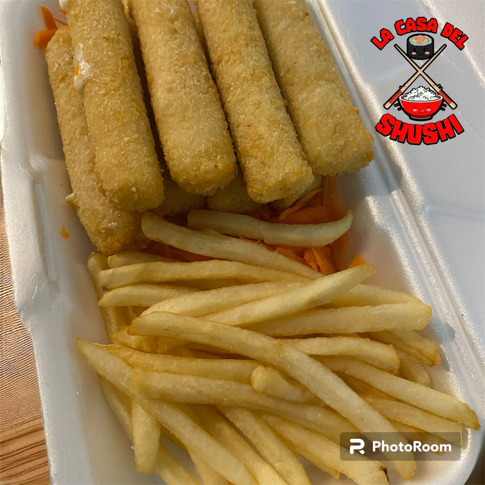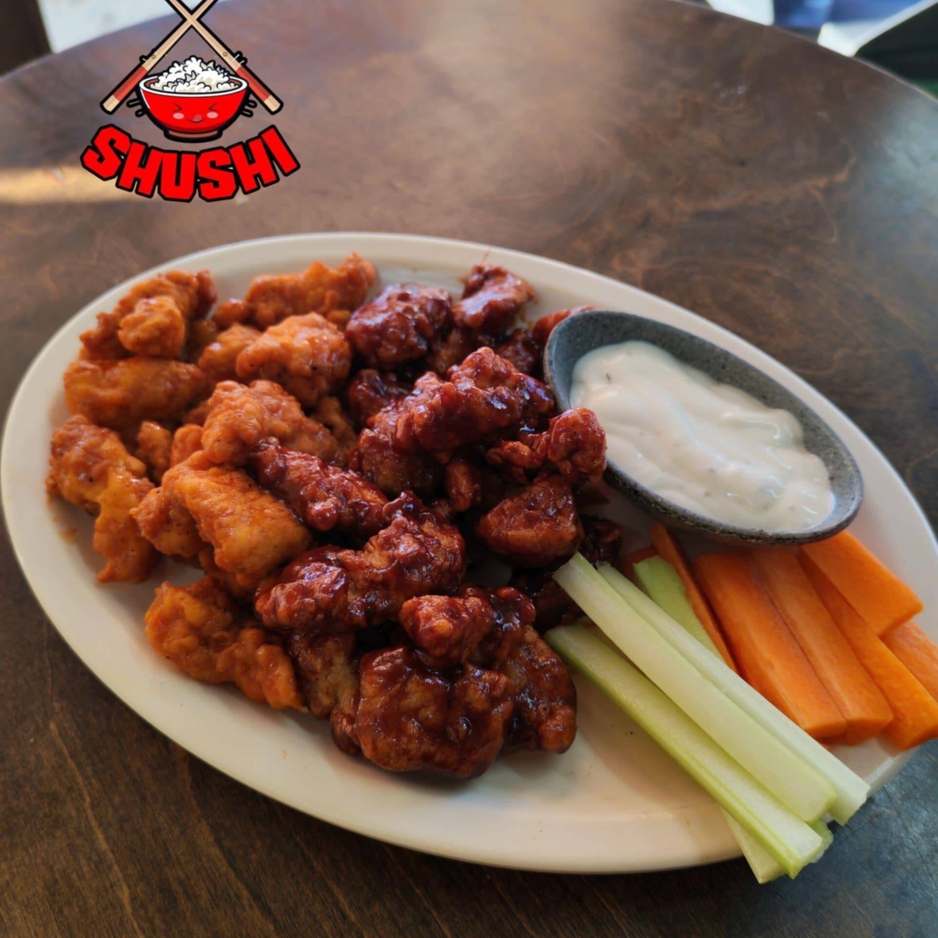 Trocitos de pechuga fritas bañadas en su salsa preferida acompañadas de bastoncitos de zanahoria y apio